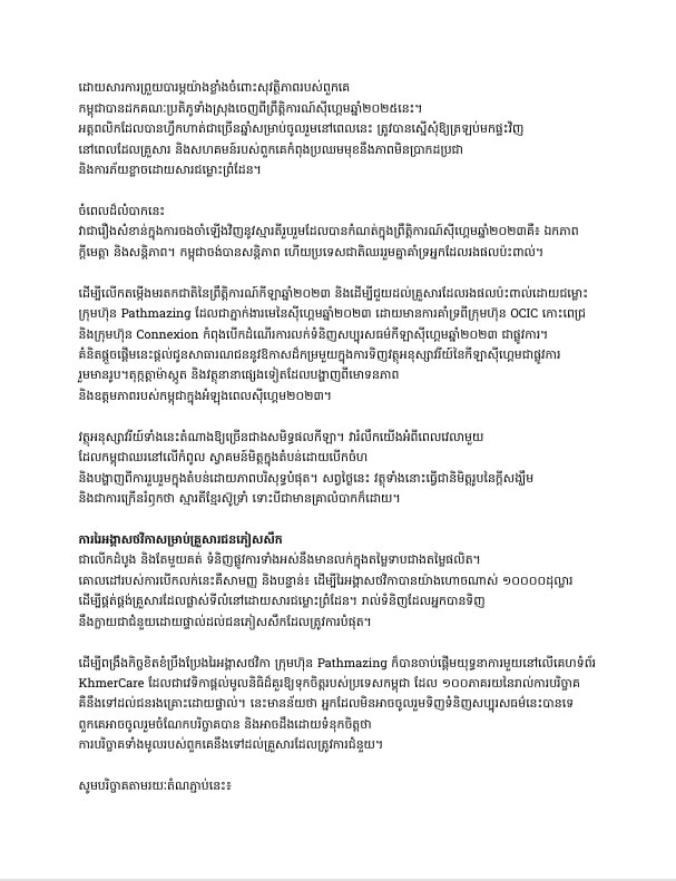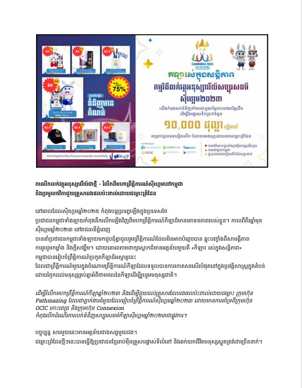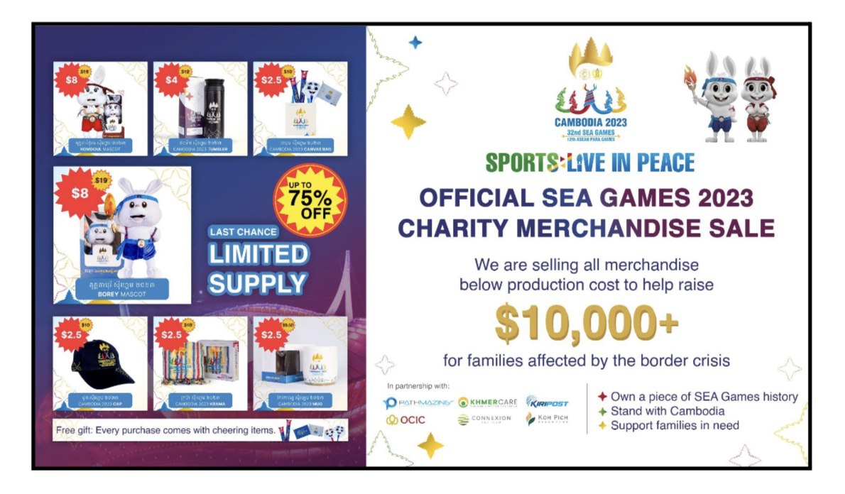 ដើម្បីលើកតម្លើងមរតកជាតិនៃព្រឹត្តិការណ៍កីឡាស៊ីហ្គេមឆ្នាំ២០២៣ និងដើម្បីជួយដល់គ្រួសារដែលរងផលប៉ះពាល់ដោយជម្លោះ ក្រុមហ៊ុន Pathmazing ដែលជាភ្នាក់ងារមេនៃស៊ីហ្គេមឆ្នាំ២០២៣ ដោយមានការគាំទ្រពីក្រុម OCIC កោះពេទ្រ និងក្រុមហ៊ុន Connexion កំពុងបើកដំណើរការលក់ទំនិញសប្បុរសធម៌កីឡាស៊ីហ្គេម ២០២៣ ។