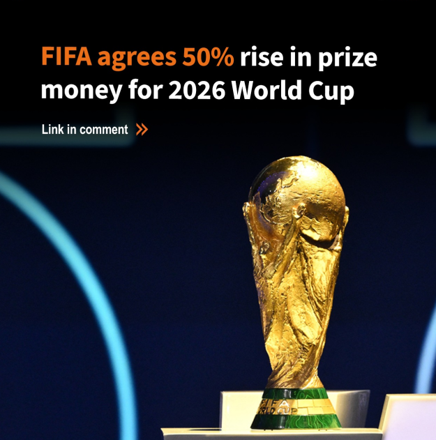 (ស្វីស)៖ ស្ថាប័នគ្រប់គ្រងបាល់ទាត់ពិភពលោក Federation International de Football Association (FIFA) យល់ព្រមដំឡើងប្រាក់រង្វាន់ 50% សម្រាប់ព្រឹត្តិការណ៍ World Cup 2026 ជំនាន់ទី២៣ ដែលមានសហរដ្ឋអាមេរិក ម៉ិកស៊ិក និងកាណាដា រៀបចំរួមគ្នាលើកដំបូងនេះ ។ នេះបើតាមការប្រកាសកាលពីថ្ងៃពុធ ទី១៧ ខែធ្នូ ឆ្នាំ២០២៥ ។