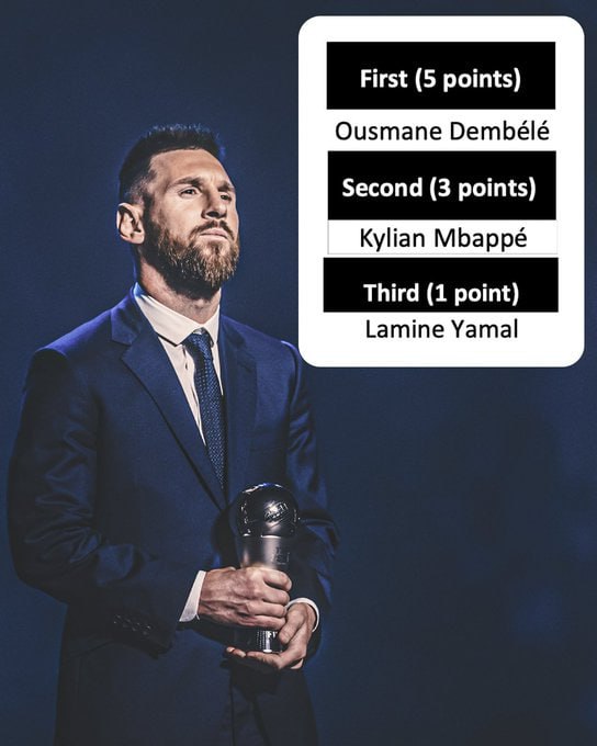 Messi ដែលធ្លាប់ឈ្នះពាន The Best FIFA បាន ៣លើកផងនោះនៅចន្លោះឆ្នាំ២០១៩ ២០២២ និងឆ្នាំ២០២៣ បានធ្វើការដាក់ពិន្ទុចំពោះជម្រើស ៣នាក់ចុងក្រោយរបស់លោកគឺ Dembele របស់ក្លឹប PSG ចំនួន ៥ពិន្ទុ លេខ២ Kylian Mbappe របស់ Real Madrid ៣ពិន្ទុ និងចុងក្រោយ ១ពិន្ទុទៅលើ Lamine Yamal មកពីក្លឹប FC Barcelona។