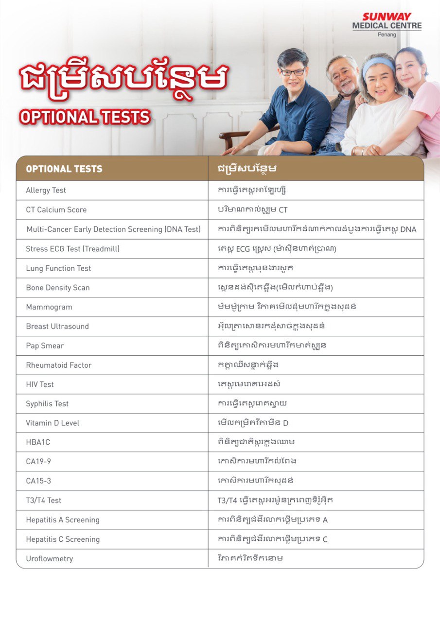 (ប៉េណាំង, ម៉ាឡេស៊ី)៖ មន្ទីរពេទ្យ Sunway Medical Centre Penang នៃប្រទេសម៉ាឡេស៊ី បានផ្តល់ជូនសេវាទេសចរណ៍សុខភាព ដោយមានការពិនិត្យសុខភាព (ទិញមួយ ថែមមួយ) ដែលភ្ជាប់ជាមួយការស្នាក់នៅសណ្ឋាគារមួយយប់ដោយឥតគិតថ្លៃ និងសេវាទៅទទួលនៅព្រលានយន្តហោះ ជាមួយអ្នកបកប្រែ ក្នុងតម្លៃត្រឹមតែ ២៣៥ដុល្លារសម្រាប់មនុស្ស២នាក់ រយៈពេល៣ថ្ងៃ។