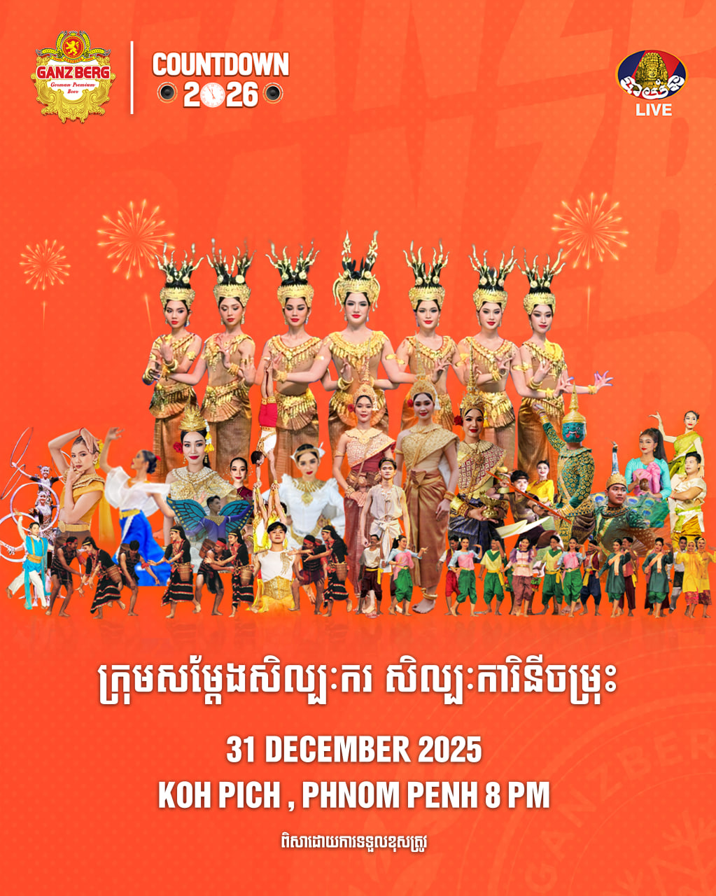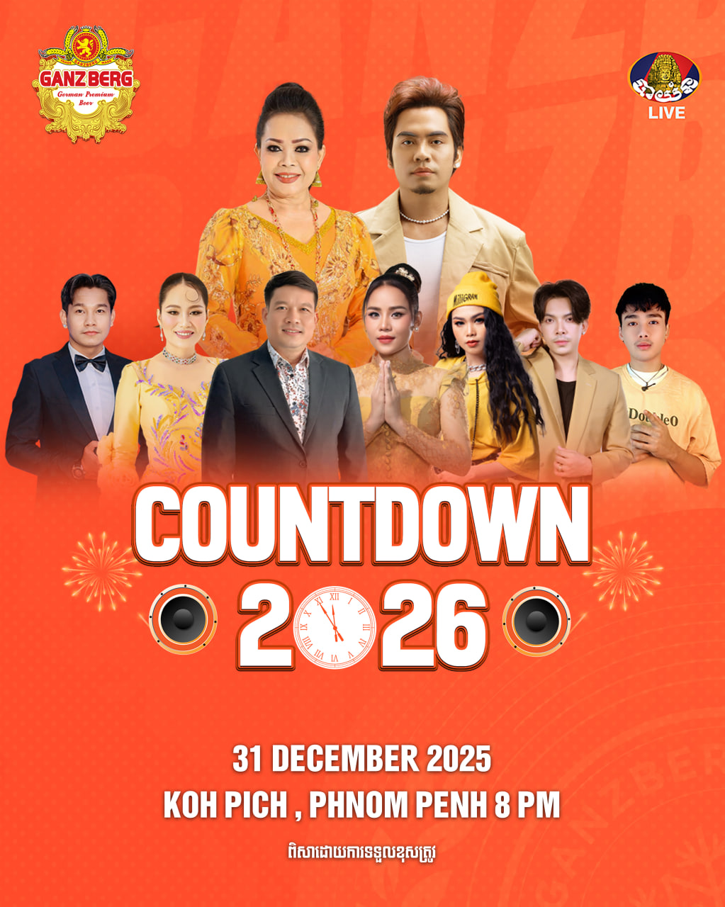(ភ្នំពេញ)៖ ក្រុមហ៊ុន GANZBERG បានរៀបចំព្រឹត្តិការណ៍អបអរសាទរថ្ងៃឆ្លងឆ្នាំថ្មី Countdown 2026 នាយប់ថ្ងៃទី៣១ ខែធ្នូ ឆ្លងចូលថ្ងៃទី០១ ខែមករា ឆ្នាំ២០២៦នេះ នៅចំនួន ២ទីតាំងផ្សេងគ្នា គឺស្ថិតនៅរាជធានីភ្នំពេញ និងខេត្តសៀមរាប។