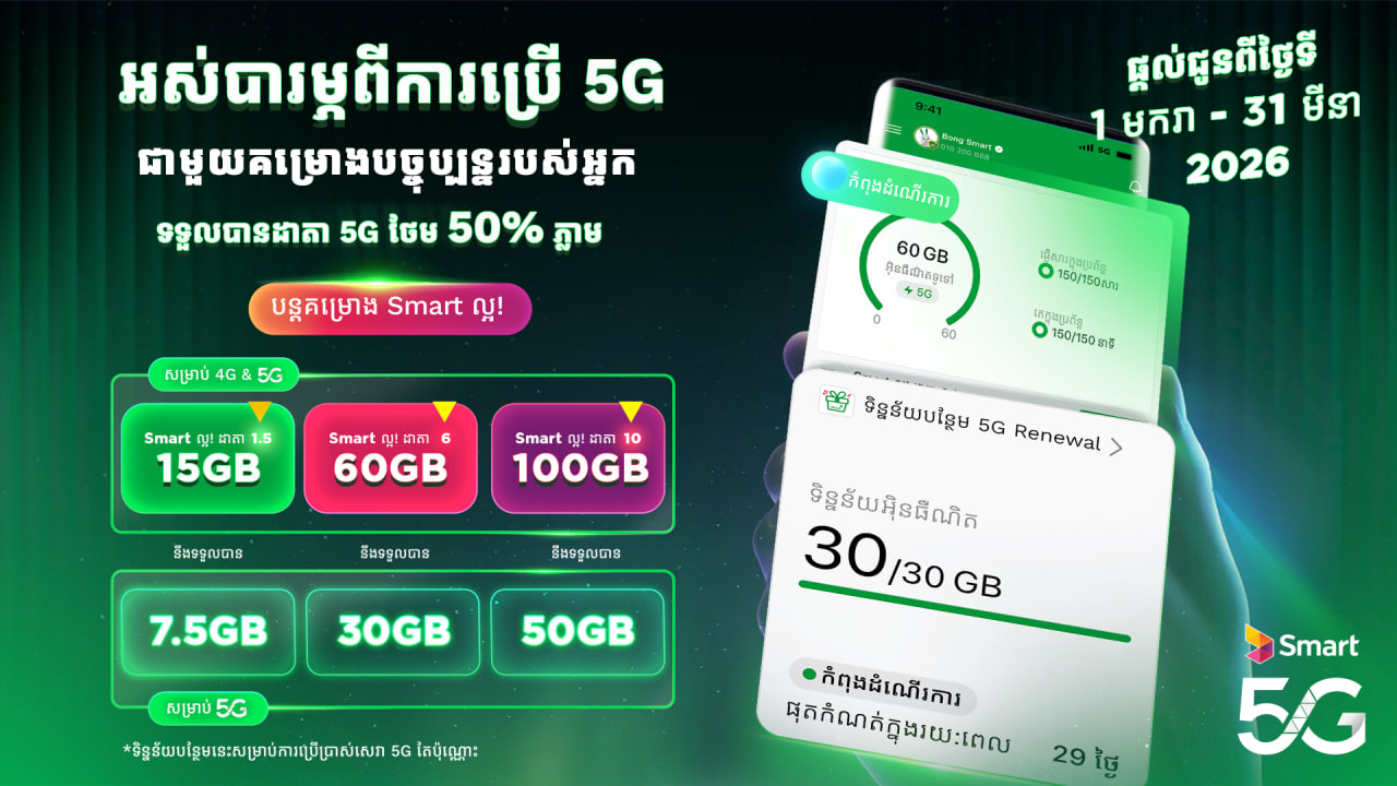 រីករាយជាមួយការផ្ដល់ជូនដាតា ៥០% បន្ថែមលើបទពិសោធន៍ 5G អតិថិជន Smart ដែលមានទូរសព្ទ ឬឧបករណ៍ដែលមានមុខងារគាំទ្របច្ចេកវិទ្យាសេវា 5G និងកំពុងប្រើប្រាស់គម្រោងផ្សេងៗរបស់ Smart អាចរីករាយជាមួយអត្ថប្រយោជន៍នៃសេវា 5G នៅក្នុងតំបន់គ្របដណ្តប់ ដោយមិនចាំបាច់ប្តូរស៊ីមកាតថ្មីឡើយ។ចាប់ពីថ្ងៃទី០១ ខែមករា ដល់ថ្ងៃទី៣១ ខែមីនា ឆ្នាំ២០២៦ រាល់ការភ្ជាប់ ឬបន្តគម្រោងដែលបានកំណត់ អតិថិជននឹងទទួលបានទិន្នន័យបន្ថែម ៥០% ភ្លាមៗ សម្រាប់ប្រើប្រាស់លើប្រព័ន្ធសេវា 5G។ ការថែមជូននេះ មានសុពលភាពសម្រាប់ប្រើប្រាស់លើប្រព័ន្ធសេវា 5G តែប៉ុណ្ណោះ ដើម្បីឱ្យអតិថិជនអាចទទួលបានបទពិសោធន៍អ៊ីនធឺណិតជំនាន់ថ្មីយ៉ាងពេញលេញ។