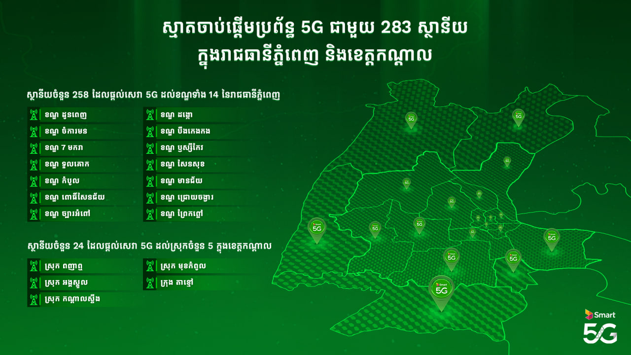 នៅដំណាក់កាលដំបូង ក្រុមហ៊ុន Smart បានដាក់ឱ្យប្រើប្រាស់សេវា 5G នៅក្នុងបណ្តារាជធានីខេត្តសំខាន់ៗ រួមមាន៖ រាជធានីភ្នំពេញ និងខេត្តកណ្តាល តាមរយៈការដំឡើងអង់តែនសេវានៅ ២៨៣ ទីតាំងដំបូង និងមានការដំឡើងបន្តនៅតាមបណ្តាខេត្តសំខាន់ៗជាបន្តបន្ទាប់។ ចំនួននេះគ្រាន់តែជាការចាប់ផ្តើមនៃផែនការពង្រីកបណ្តាញសេវា 5G ប្រចាំឆ្នាំរបស់ក្រុមហ៊ុនប៉ុណ្ណោះ។