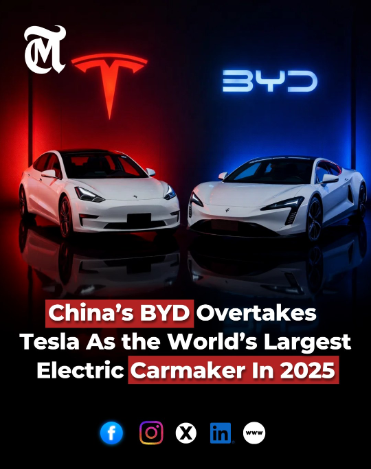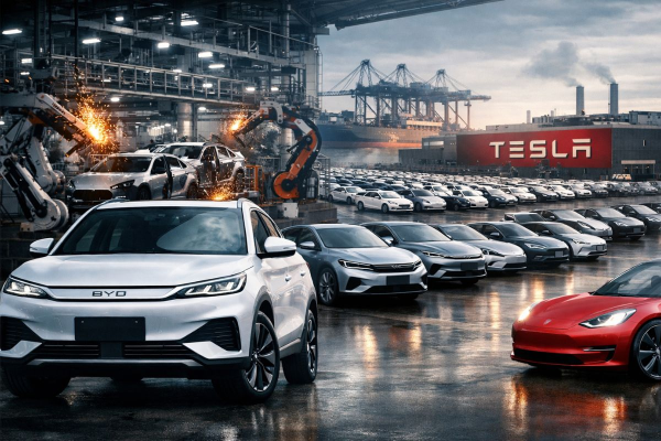 BYD រាយការណ៍ពីការចែកចាយរថយន្តបានចំនួន ២.២៦លានគ្រឿងនៅឆ្នាំ២០២៥ ដែលជាការកើនឡើងជិត ២៨% ពីឆ្នាំមុន ដែលជំរុញដោយតម្រូវការខ្លាំងនៅក្នុងប្រទេសចិន និងការពង្រីកយ៉ាងឆាប់រហ័សនៅក្នុងទីផ្សារក្រៅប្រទេស។ ងាកមក Tesla បានចែកចាយរថយន្តចំនួន ១.៦៤លានគ្រឿង ដែលជាការធ្លាក់ចុះ ៨% និងជាការធ្លាក់ចុះប្រចាំឆ្នាំជាប់ៗគ្នាលើកទីពីរ ខណៈដែលក្រុមហ៊ុននេះ ប្រឈមនឹងការប្រកួតប្រជែងកើនឡើង, ភាពចម្រូងចម្រាសនយោបាយ និងការលុបចោលបន្តិចម្តងៗនៃឥណទានពន្ធរថយន្តអគ្គិសនីរបស់សហរដ្ឋអាមេរិក។