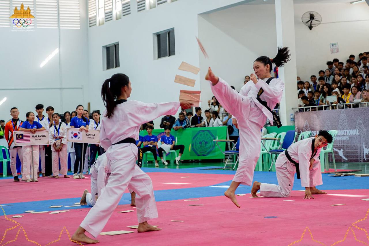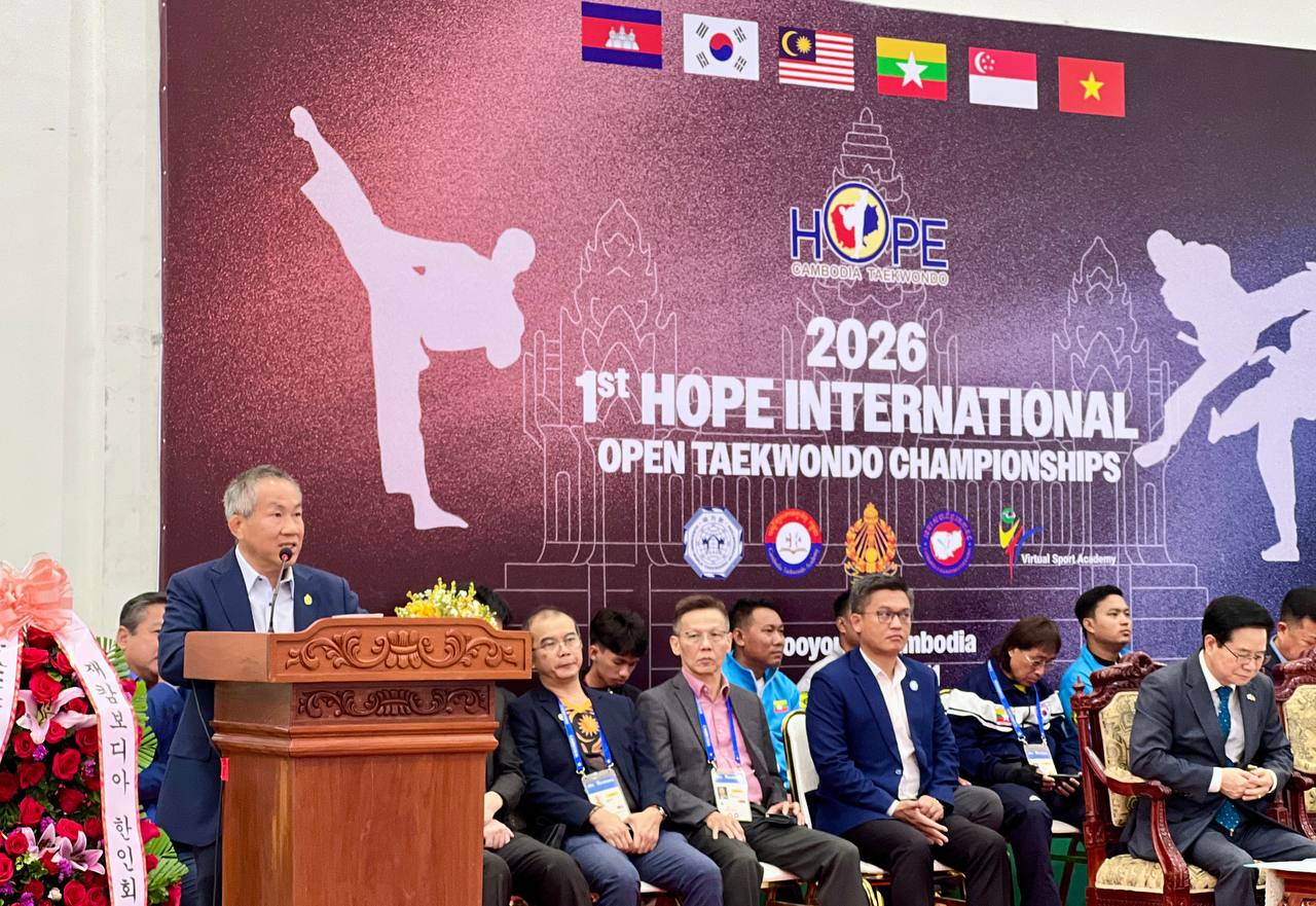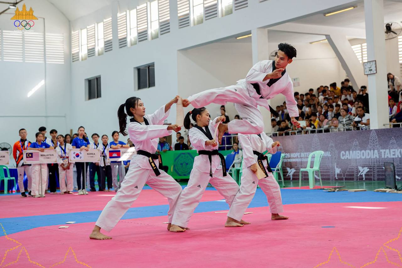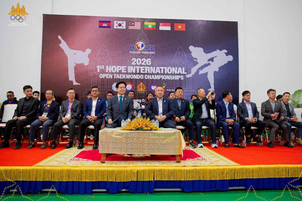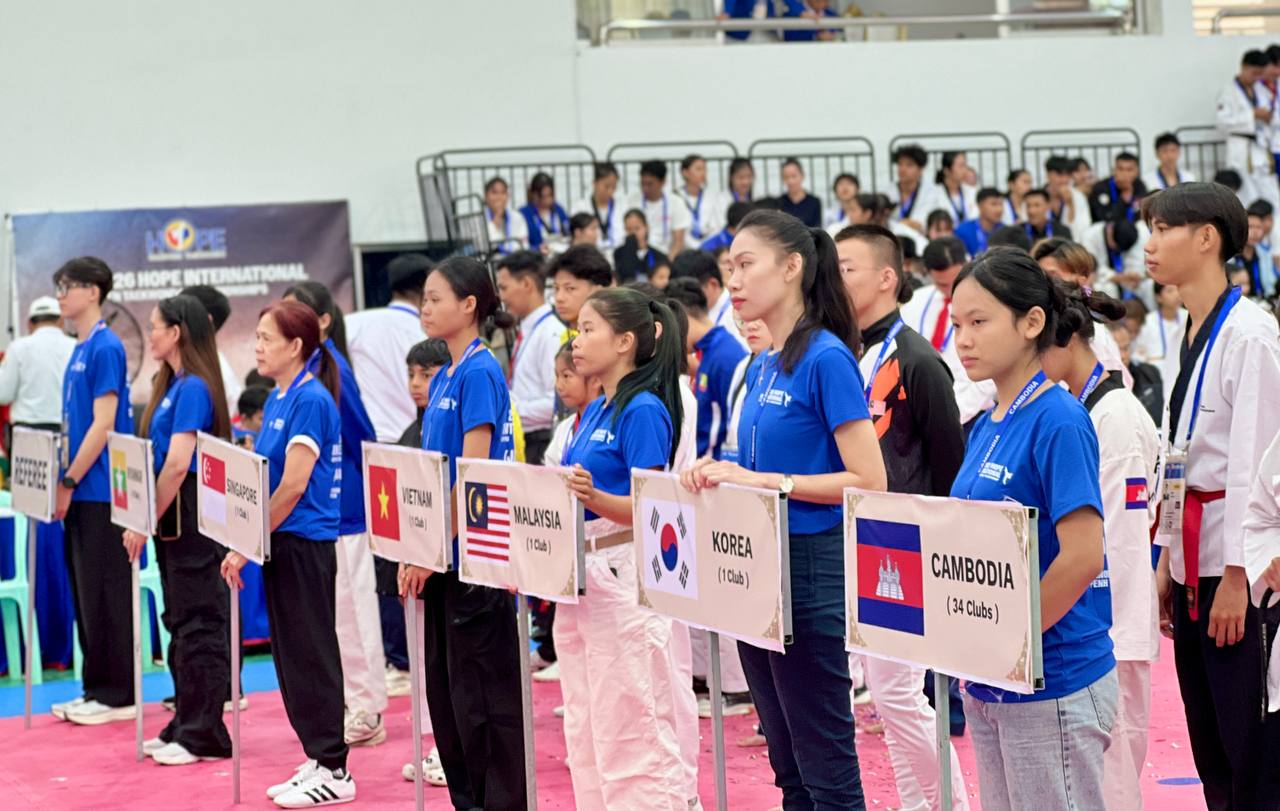 (ភ្នំពេញ)៖ កីឡាករ-កីឡាការិនីថ្នាលយុវជតេក្វាន់ដូ WT មកពី ៦ប្រទេស រួមមានមីយ៉ាន់ម៉ា សិង្ហបុរី វៀតណាម ម៉ាឡេស៊ី កូរ៉េខាងត្បូង និងម្ចាស់ផ្ទះកម្ពុជា បានចូលរួមព្រឹត្តិការណ៍ប្រកួតអន្ដរក្លិបកីឡាតេក្វាន់ដូ WT លក្ខណៈអន្ដរជាតិ Hope International Open Taekwondo Championship លើកទី១ ឆ្នាំ២០២៦ នៅកម្ពុជា ដែលនឹងប្រព្រឹត្តទៅពីថ្ងៃទី៩-១១ ខែមករា នៅសាលដំបូលទូក នៃពហុកីឡដ្ឋានជាតិ(អូឡាំពិក)។
