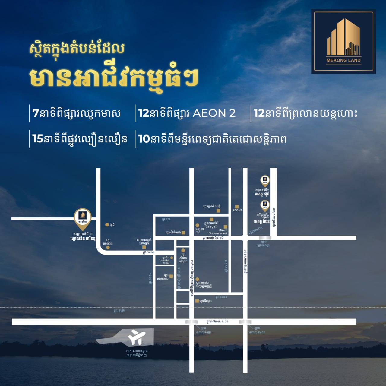 គម្រោងមួយនេះស្ថិតក្នុងទីប្រជុំជនដ៏អ៊ូអរ ជិតផ្សារ សាលារៀន មន្ទីរពេទ្យ និងធនាគារ ដែលធានាបាននូវភាពងាយស្រួលសម្រាប់ការធ្វើដំណើរ និងការទាក់ទាញអតិថិជនសម្រាប់អាជីវកម្មធំតូចគ្រប់ប្រភេទ។