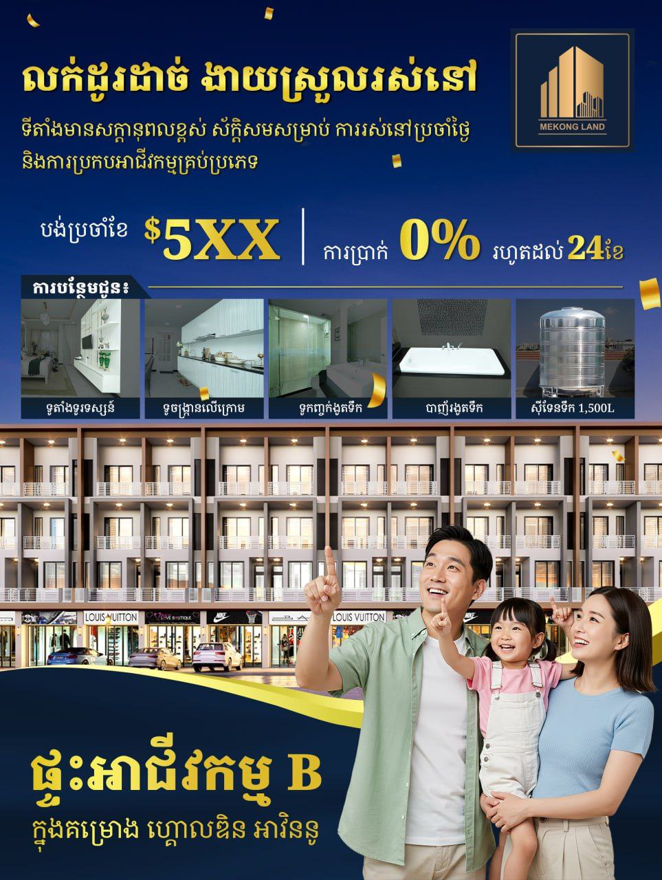 កាន់តែពិសេស ផ្ទះអាជីវកម្ម B នេះបង់ប្រចាំខែត្រឹមតែ 5xx$ ប៉ុណ្ណោះ, បង់ដោយឥតការប្រាក់ ០% រហូតដល់ ២៤ខែ, និងលទ្ធភាពទទួលបានកម្ចីរយៈពេលវែងរហូតដល់ ៣០ឆ្នាំ។