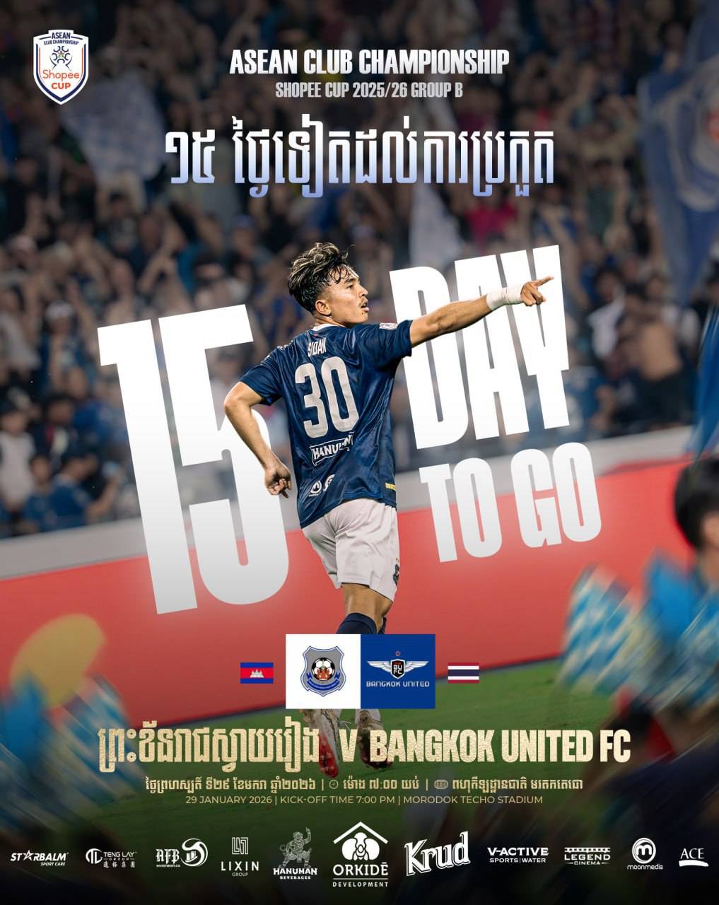 (ភ្នំពេញ)៖ ក្រុមជើងឯកលីគកំពូលកម្ពុជា ព្រះខ័នរាជស្វាយរៀង បានត្រៀមខ្លួនជាស្រេច ក្នុងការបើកទ្វារពហុកីឡដ្ឋានជាតិមរតកតេជោជាថ្មី ដើម្បីស្វាគមន៍ក្រុម Bangkok United របស់ថៃ ក្នុងពានរង្វាន់ជើងឯកក្លឹបបាល់ទាត់អាស៊ីអាគ្នេយ៍ (ASEAN Club Championship Shopee Cup) ឆ្នាំ២០២៥/២៦ ពូល B នាថ្ងៃទី២០៩ ខែមករាខាងមុខ។