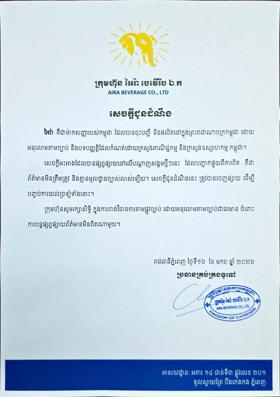 (ភ្នំពេញ)៖ ក្រុមហ៊ុន អៃរ៉ា បេវើរីច ឯ.ក បានអះអាងថា អៃរ៉ា គឺជាម៉ាកសញ្ញារបស់កម្ពុជា ដែលបានចុះបញ្ជី និងផលិតនៅក្នុងព្រះរាជាណាចក្រកម្ពុជា ដោយអនុលោមតាមច្បាប់ និងបទបញ្ញត្តិដែលកំណត់ដោយក្រសួងពាណិជ្ជកម្ម និងក្រសួងឧស្សាហកម្ម កម្ពុជា។