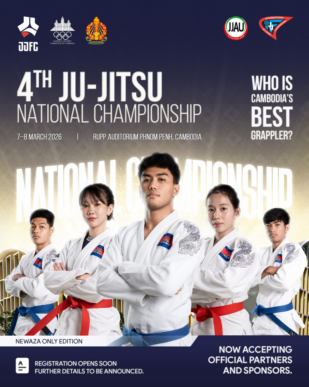 ការប្រកួតជើងឯក 4th Ju-Jitsu National Championship គឺនិងបង្ហាញអំពីការរីកចម្រើនសិល្បៈក្បាច់គុននៅក្នុងប្រទេសកម្ពុជាជាមួយគ្នា ដោយសហ័ពន្ធបានសម្លឹងមើលចំពោះការប្រកួតជើងឯកតំបន់អាស៊ីអាគ្នេយ៍នៅខែសីហា ឆ្នាំ 2026 នៅខេត្តសៀមរាប ដែលនឹងក្លាយជាកន្លែងស្ថិតនៅលើការរំពឹងថា នឹងមានអត្តពលិកជាង ៥០០នាក់មកពីគ្រប់ប្រទេសទូទាំងតំបន់អាស៊ីអាគ្នេយ៍។ ព័ត៌មានលម្អិតអំពីការចុះឈ្មោះនឹងមកដល់ឆាប់ៗនេះ៕