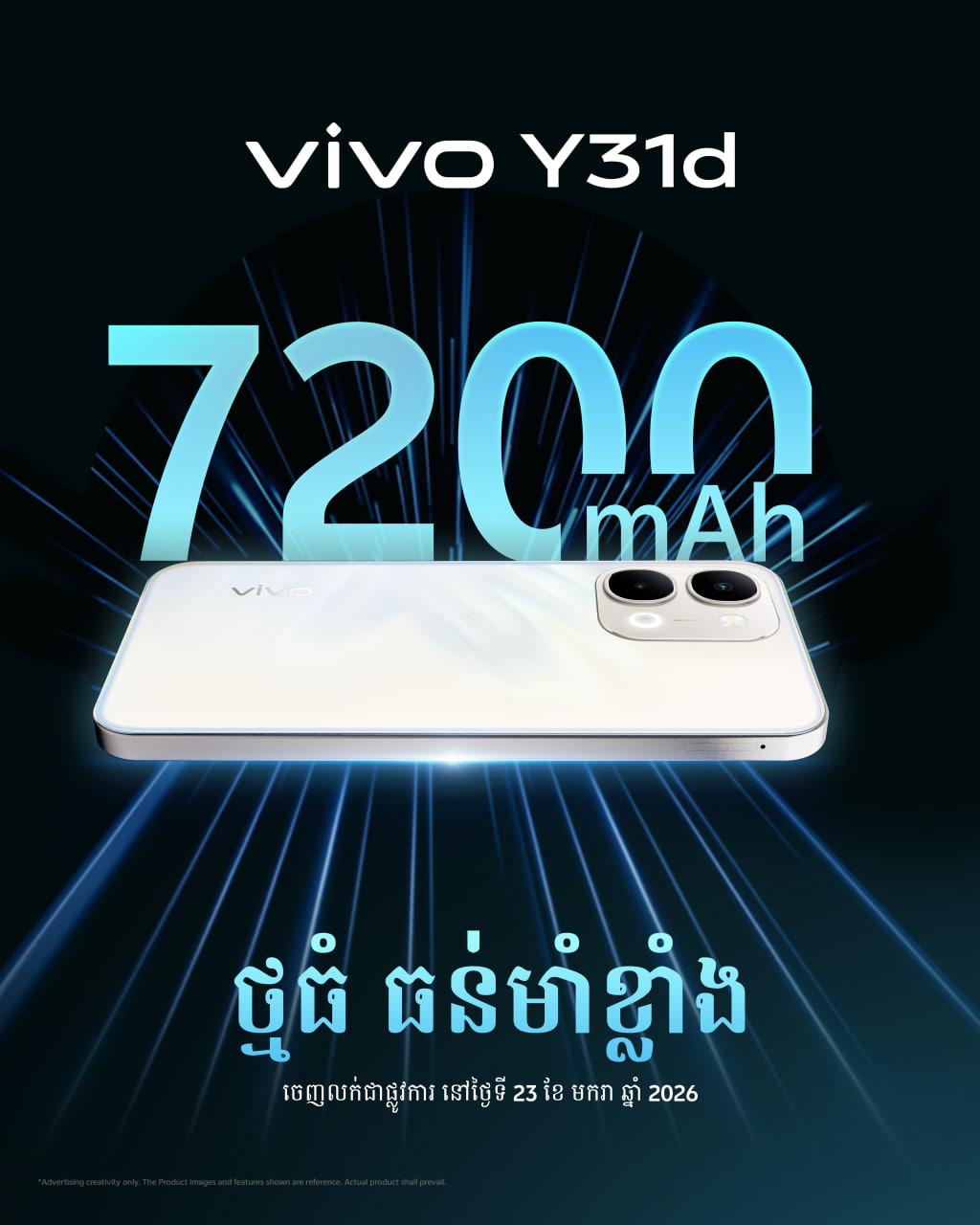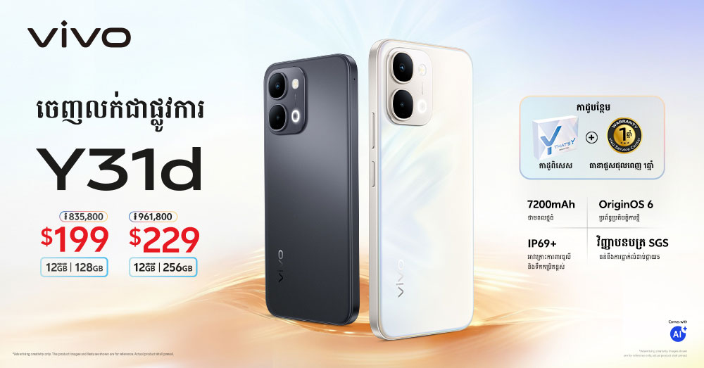 (ភ្នំពេញ)៖ នៅថ្ងៃទី២៣ ខែមករា ឆ្នាំ២០២៦នេះ ក្រុមហ៊ុន vivo បានប្រកាសចេញលក់ផ្លូវការនូវស្មាតហ្វូនស៊េរីថ្មី vivo Y31d ដែលជាស្មាតហ្វូនរចនាឡើង សម្រាប់ផ្តល់ថាមពលប្រើប្រាស់បានយូរ ប្រតិបត្តិការដោយរលូន និងភាពធន់មាំខ្លាំង សម្រាប់ការប្រើប្រាស់ប្រចាំថ្ងៃដោយទំនុកចិត្ត។