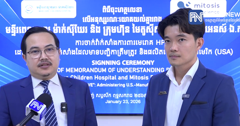(ភ្នំពេញ)៖ ក្នុងឱកាសអបអរសាទរ «ខែនៃការលើកកម្ពស់ការយល់ដឹងអំពីជំងឺមហារីកមាត់ស្បូន Cervical Cancer Awareness Month» មន្ទីរពេទ្យកុមារ ម៉ាក់ស៊ីឃែរ (Maxicare Children Hospital) និងក្រុមហ៊ុន មៃគូស៊ីសស៍ បៃអូសាយអេនស៍ ឯ.ក (Mitosis Bioscience) នៅថ្ងៃទី២៣ខែមករា ឆ្នាំ២០២៦ បានចុះហត្ថលេខាលើអនុស្សរណៈយោគយល់គ្នា ដើម្បីបង្កើតភាពជាដៃគូយុទ្ធសាស្ត្រក្នុងការផ្តល់សេវាចាក់វ៉ាក់សាំងការពារមេរោគ HPV ដែលមានគុណភាពខ្ពស់បំផុត (ស្តង់ដារសហរដ្ឋអាមេរិក) និងមានបញ្ជីការត្រឹមត្រូវពីក្រសួងសុខាភិបាល។