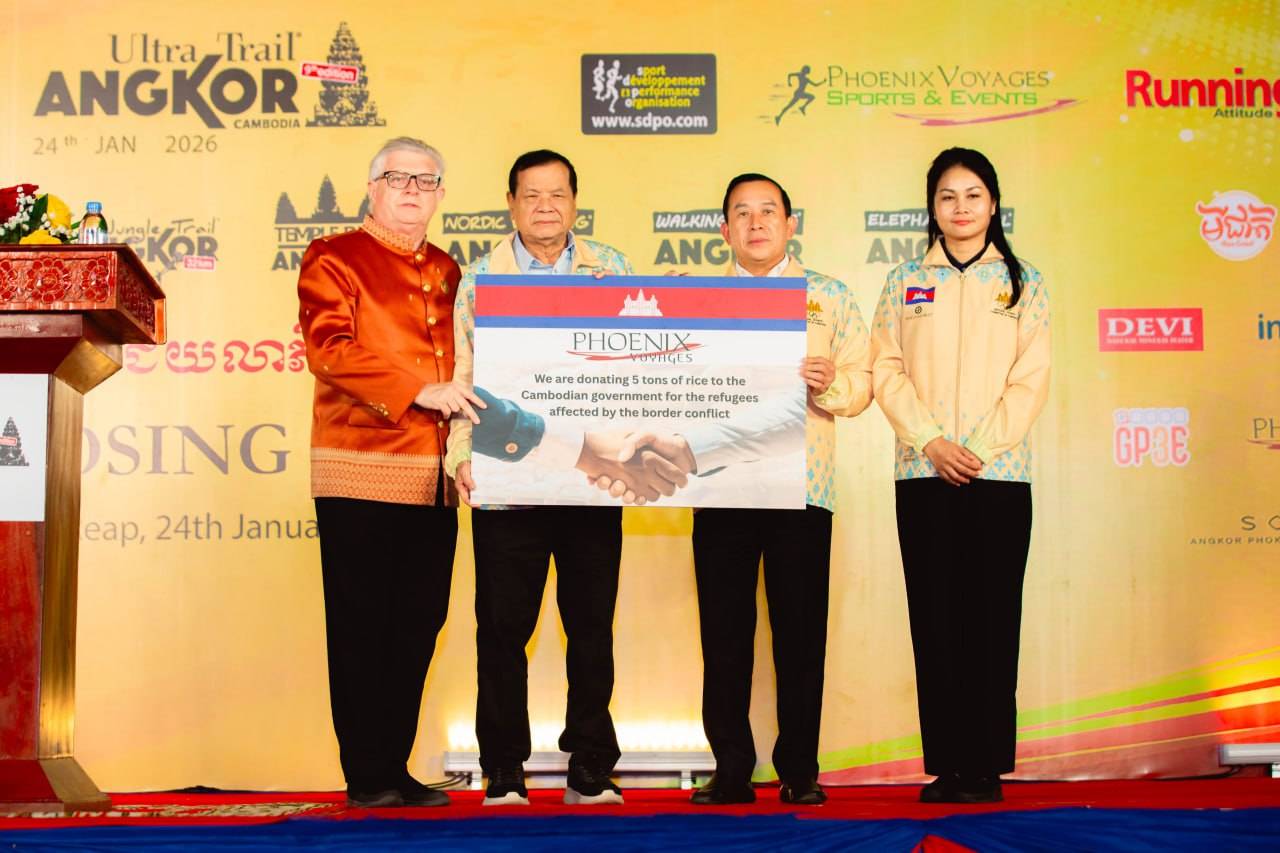 គួរដឹងថា ពិធីប្រគល់រង្វាន់ជយលាភី ដល់កីឡាករ-កីឡាការិនីចូលរួមទិវារត់ប្រណាំងឆ្លងកាត់ឧបសគ្គចម្ងាយឆ្ងាយអង្គរ លើកទី៩ បានធ្វើឡើងក្រោមវត្តមានលោកបណ្ឌិត ថោង ខុន ទេសរដ្ឋមន្ដ្រី និងជាប្រធានគណៈកម្មាធិការជាតិអូឡាំពិកកម្ពុជា ហើយក៏មានការចូលរួមពីលោក ហួត ហាក់ រដ្ឋមន្ដ្រីក្រសួងទេសចរណ៍ផងដែរ។ ទន្ទឹមជាមួយគ្នានោះ លោក Edouard Gorge អគ្គនាយកក្រុមហ៊ុន Phoenix Voyages ដែលជាដៃគូសហការរៀបចំព្រឹត្តិការណ៍នេះ ក៏បានប្រគល់អង្ករចំនួន ៥តោន តាមរយៈ NOCC ដល់រដ្ឋបាលខេត្តសៀមរាប សម្រាប់ចែកជូនដល់ជនភៀសសឹកផងដែរ៕