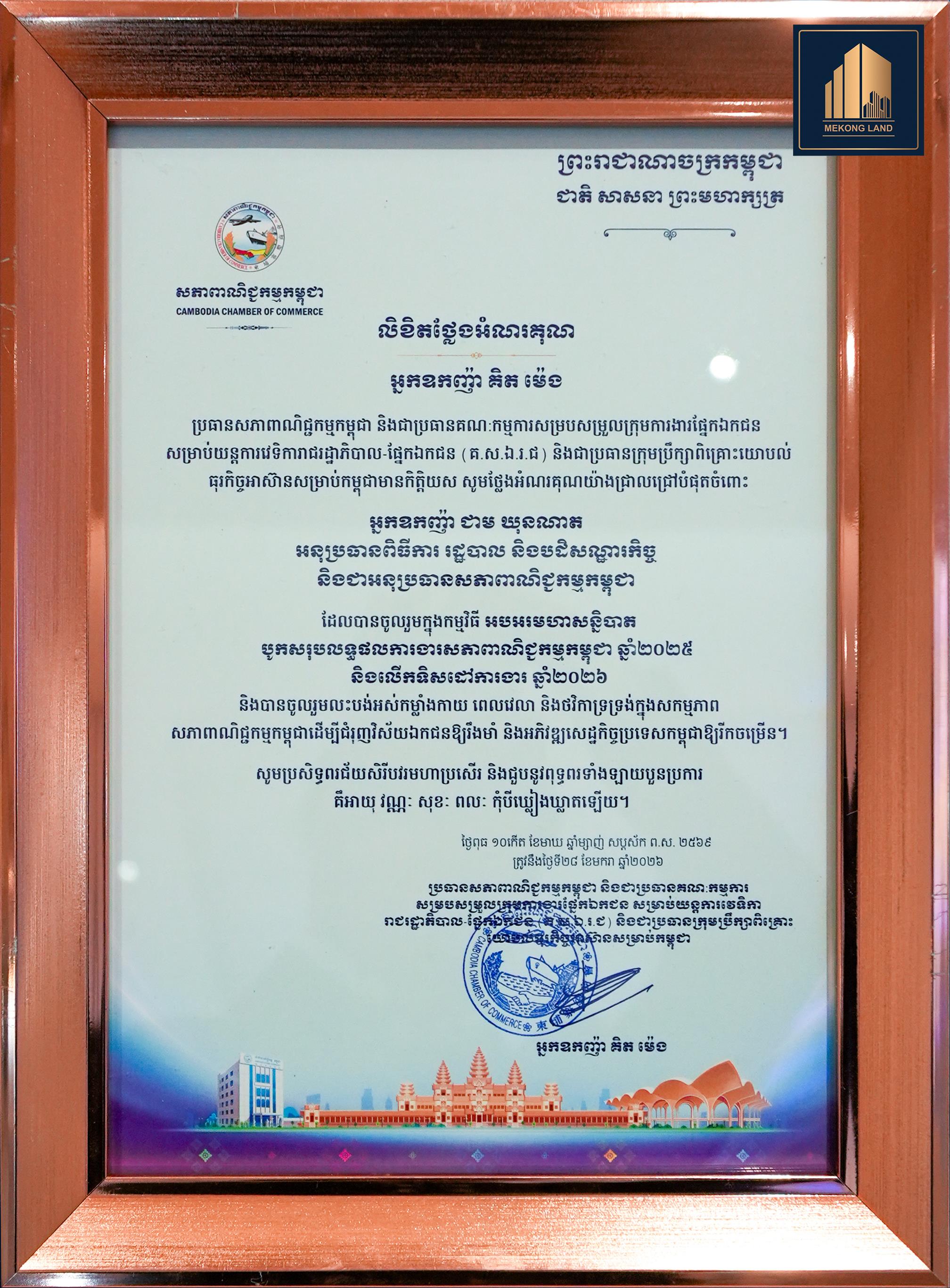 ក្នុងឱកាសនោះ អ្នកឧកញ៉ា ជាម ឃុនណាត អគ្គនាយក បុរី មេគង្គ លែនបានទទួល លិខិតថ្លែងអំណរគុណ ពី អ្នកឧកញ៉ា គិត ម៉េង ជាការទទួលស្គាល់ចំពោះការចូលរួមឧបត្ថម្ភ និងការគាំទ្រយ៉ាងសកម្មចំពោះសកម្មភាព និងបេសកកម្មរបស់សភាពាណិជ្ជកម្មកម្ពុជា ក្នុងការជំរុញការអភិវឌ្ឍវិស័យឯកជន និងសេដ្ឋកិច្ចជាតិ។