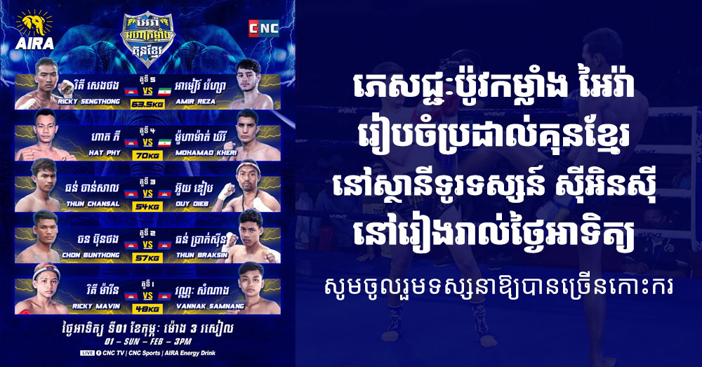 ភេសជ្ជៈប៉ូវកម្លាំង អៃរ៉ា រៀបចំប្រដាល់គុនខ្មែរ នៅស្ថានីទូរទស្សន៍ សុីអិនសុី នៅរៀងរាល់ថ្ងៃអាទិត្យ សូមចូលរួមទស្សនាឱ្យបានច្រេីនកោះករ