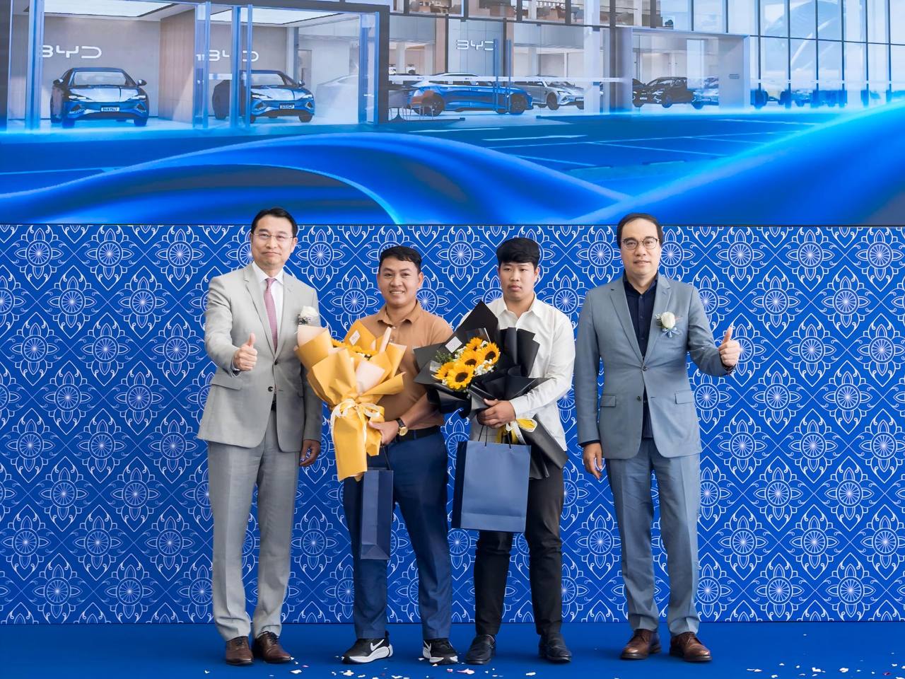 លោក Liu Xueliang (ឆ្វេងបង្អស់) និងលោក Feng Changge (ស្តាំបង្អស់) ប្រគល់រថយន្តជូនអតិថិជនដំបូងគេនៃសាខាថ្មី