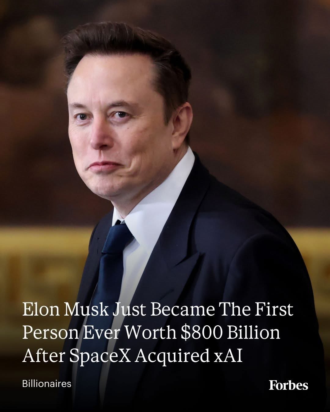 យោងតាមការប៉ាន់ប្រមាណពីទស្សនាវដ្តី Forbes កិច្ចព្រមព្រៀងដ៏ធំសម្បើមនេះបានធ្វើឱ្យតម្លៃក្រុមហ៊ុនដែលច្របាច់បញ្ចូលគ្នាថ្មី (SpaceX + xAI) ហក់ឡើងដល់ ១,២៥ ទ្រីលានដុល្លារ។ ការវិវឌ្ឍនេះបានបន្ថែមទ្រព្យសម្បត្តិសុទ្ធជូនលោក Musk ចំនួន ៨៤ ពាន់លានដុល្លារ បន្ថែមទៀត ដែលធ្វើឱ្យទ្រព្យសម្បត្តិសរុបរបស់លោកឡើងដល់កម្រិតខ្ពស់បំផុតមិនធ្លាប់មានគឺ ៨៥២ ពាន់លានដុល្លារ។