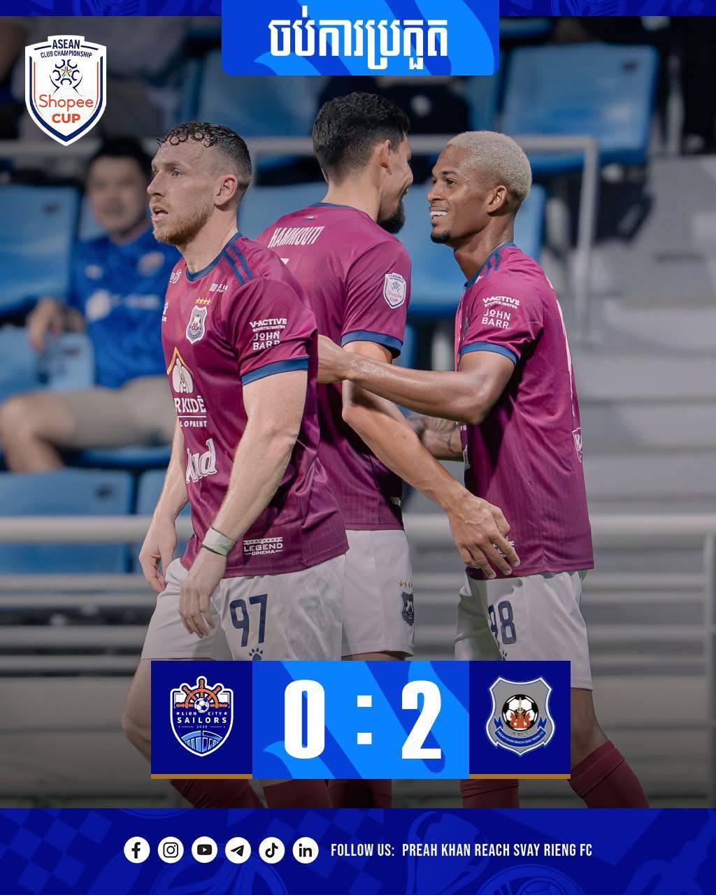 (សិង្ហបុរី)៖ ក្រុមព្រះខ័នរាជស្វាយរៀង របស់កម្ពុជា បានយកឈ្នះក្រុមម្ចាស់ផ្ទះ Lion City Sailors របស់សិង្ហបុរី ដោយលទ្ធផល ២-០ ក្នុងជំនួបពូល B នៃពានរង្វាន់ជើងឯកក្លិបអាស៊ាន ASEN Club Championship Shopee Cup 2025/26 នៅរាត្រីថ្ងៃទី០៥ ខែកុម្ភៈ ឆ្នាំ២០២៦ នេះ។ ប៉ុន្ដែការបន្ថែម ៣ពិន្ទុនេះ មិនអាចជួយឲ្យក្រុមកម្ពុជា រក្សាក្ដីសង្ឃឹមស្វែងរកកៅអីវគ្គបន្ដទៀតបានឡើយ ក្រោយក្រុម Johor Darul Ta’zim របស់ម៉ាឡេស៊ី វាយបកស្មើក្រុមម្ចាស់ផ្ទះ Nam Dinh របស់វៀតណាម ១-១ នៅចុងម៉ោង។