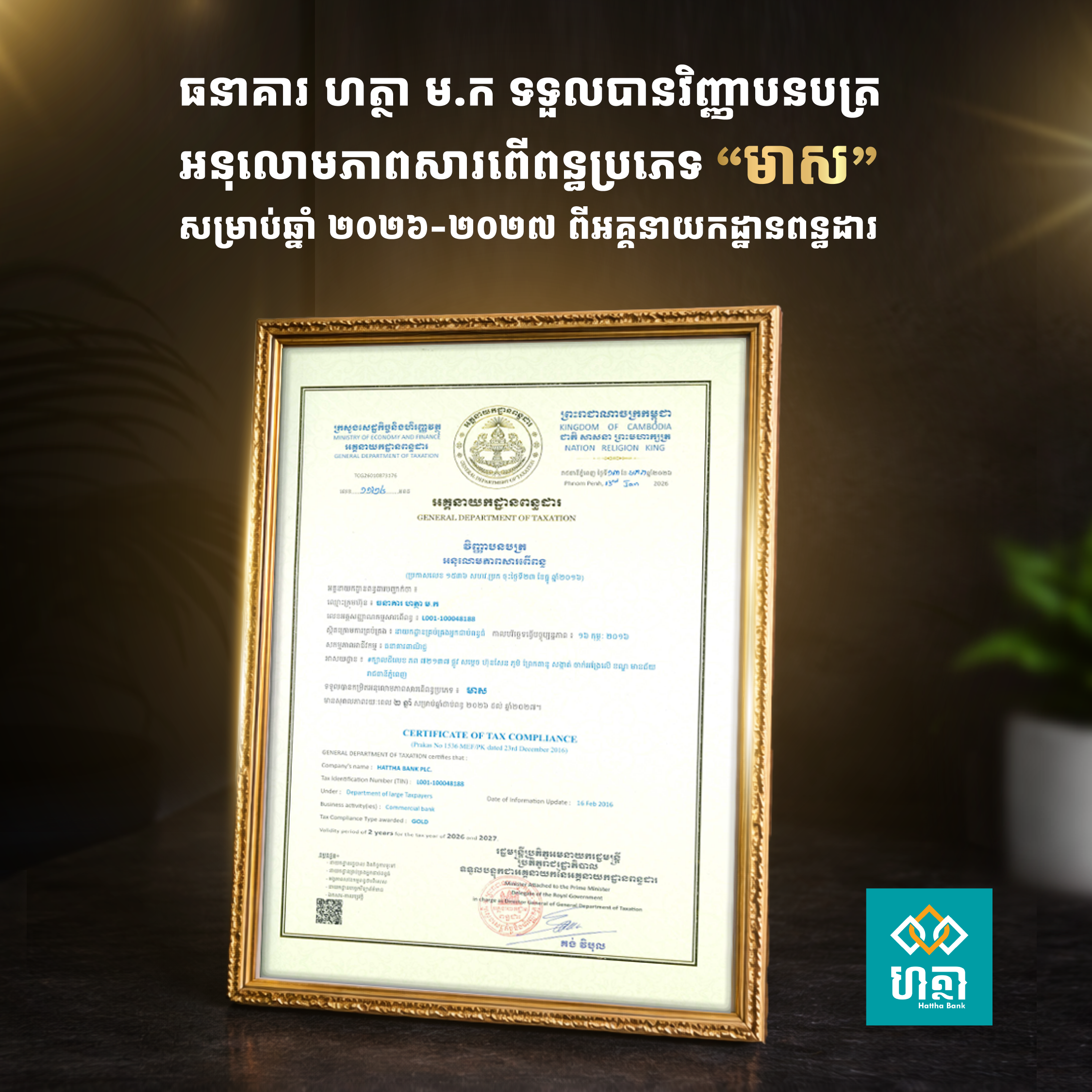 ធនាគារ ហត្ថា ទទួលបានវិញ្ញាបនបត្រកម្រិតអនុលោមភាពសារពើពន្ធប្រភេទ «មាស»ពីអគ្គនាយកដ្ឋានពន្ធដារ