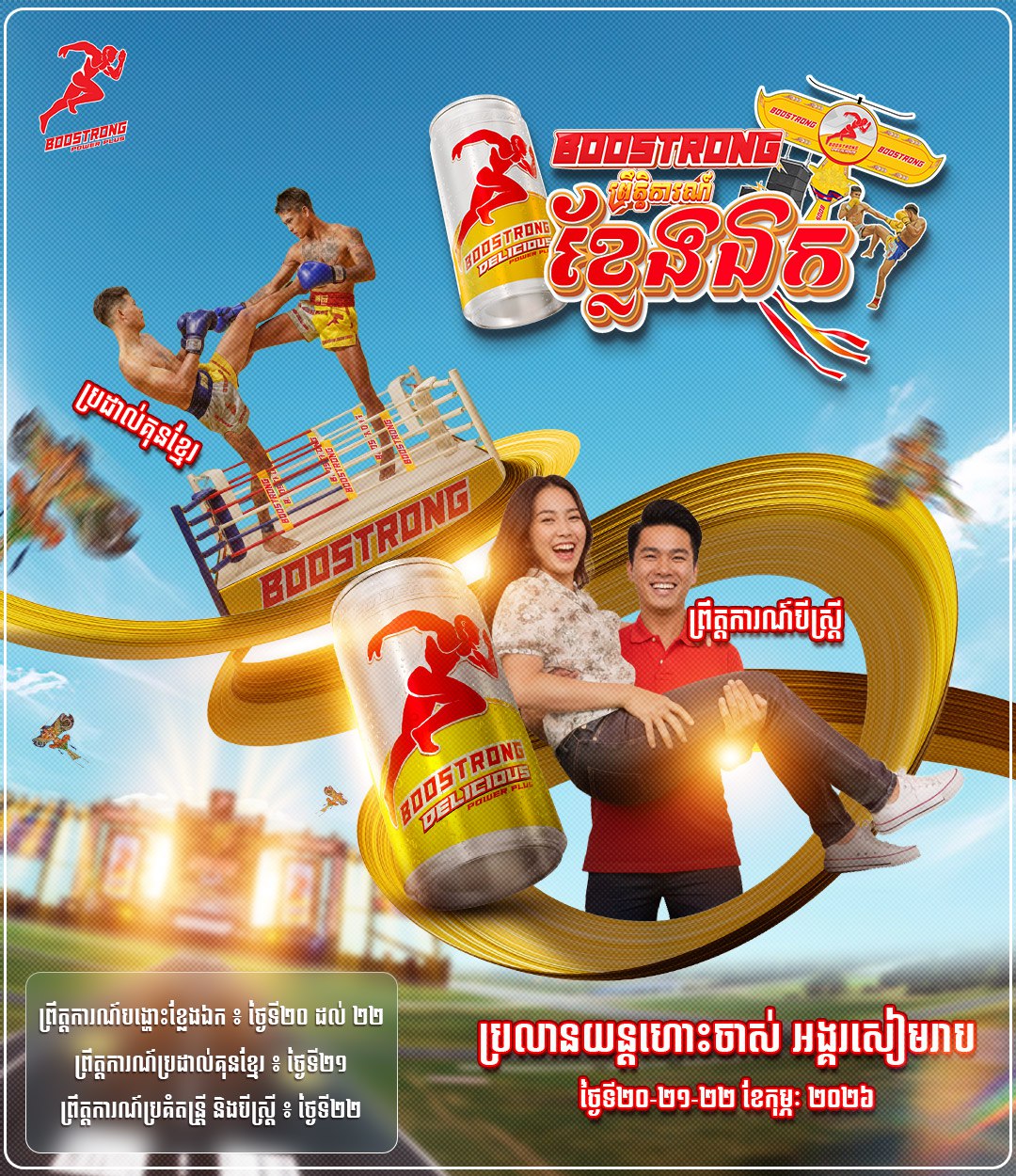 ព្រឹត្តការណ៍ប៊ូសស្រ្តង នឹងប្រារព្ធឡើងនៅថ្ងៃទី២០,២១ និង២២ ខែកុម្ភៈ ឆ្នាំ២០២៦ ដោយរួមមានការប្រកួតបង្ហោះខ្លែងឯក និងខ្លែងសេរី, ព្រឹត្តិការណ៍ប្រកួតបីស្រ្តី ឈ្នះម៉ូតូថ្មី ទូរទស្សន៍ និងទូរស័ព្ទដៃទំនើប, ព្រឹត្តិការណ៍ប៊ូសស្រ្តងគុនខ្មែរ និងព្រឹត្តិការណ៍ប៊ូសស្រ្តងប្រគំតន្រ្តី មានកំពូលតារារ៉េបលោក G-Devith, ទេព ពិសិដ្ឋ, OG និងតារាចម្រៀងជាច្រើនរូបទៀត។