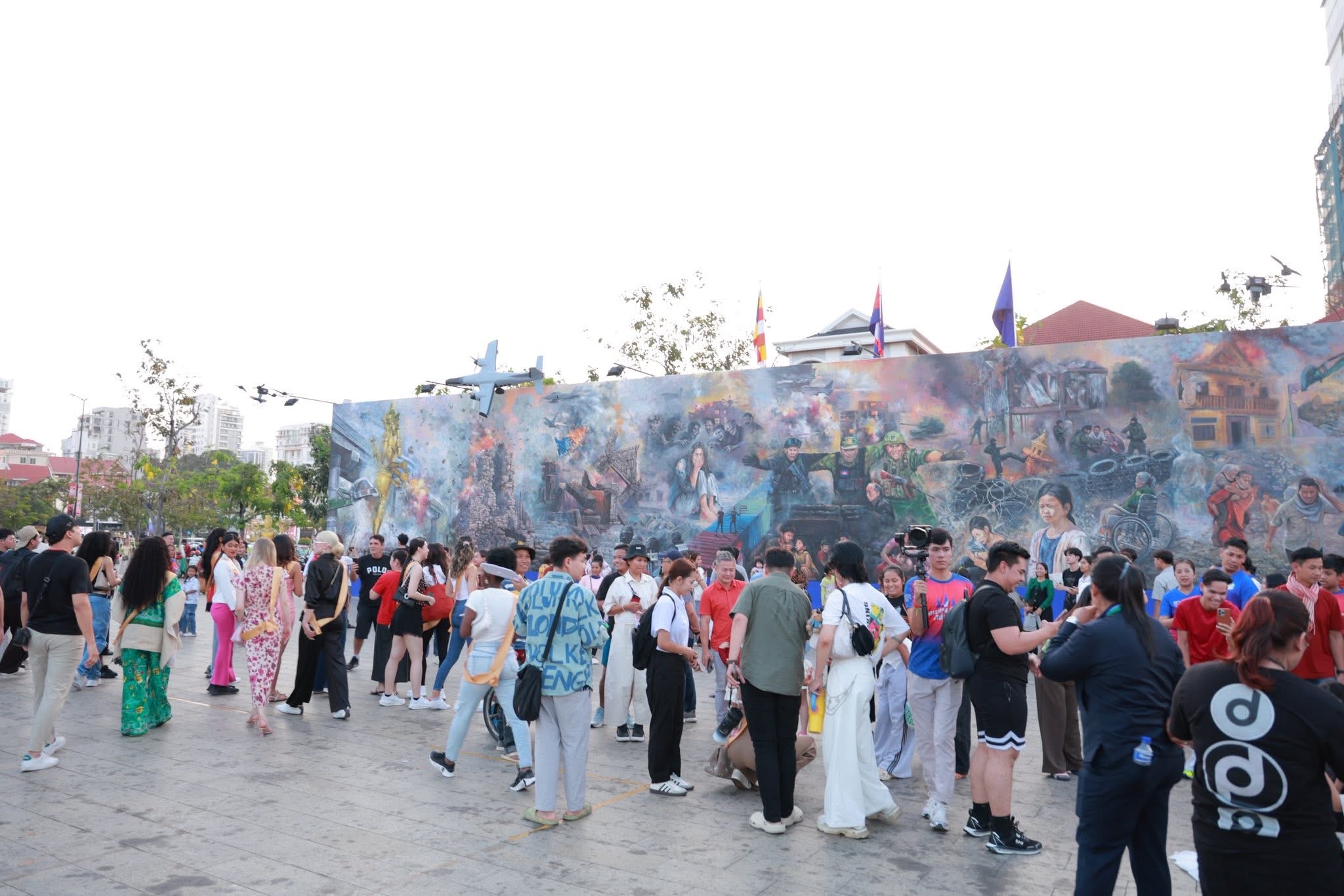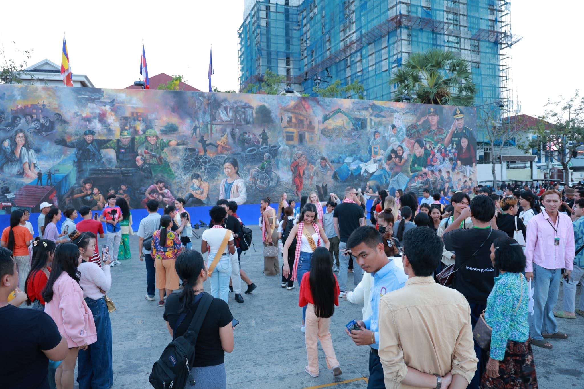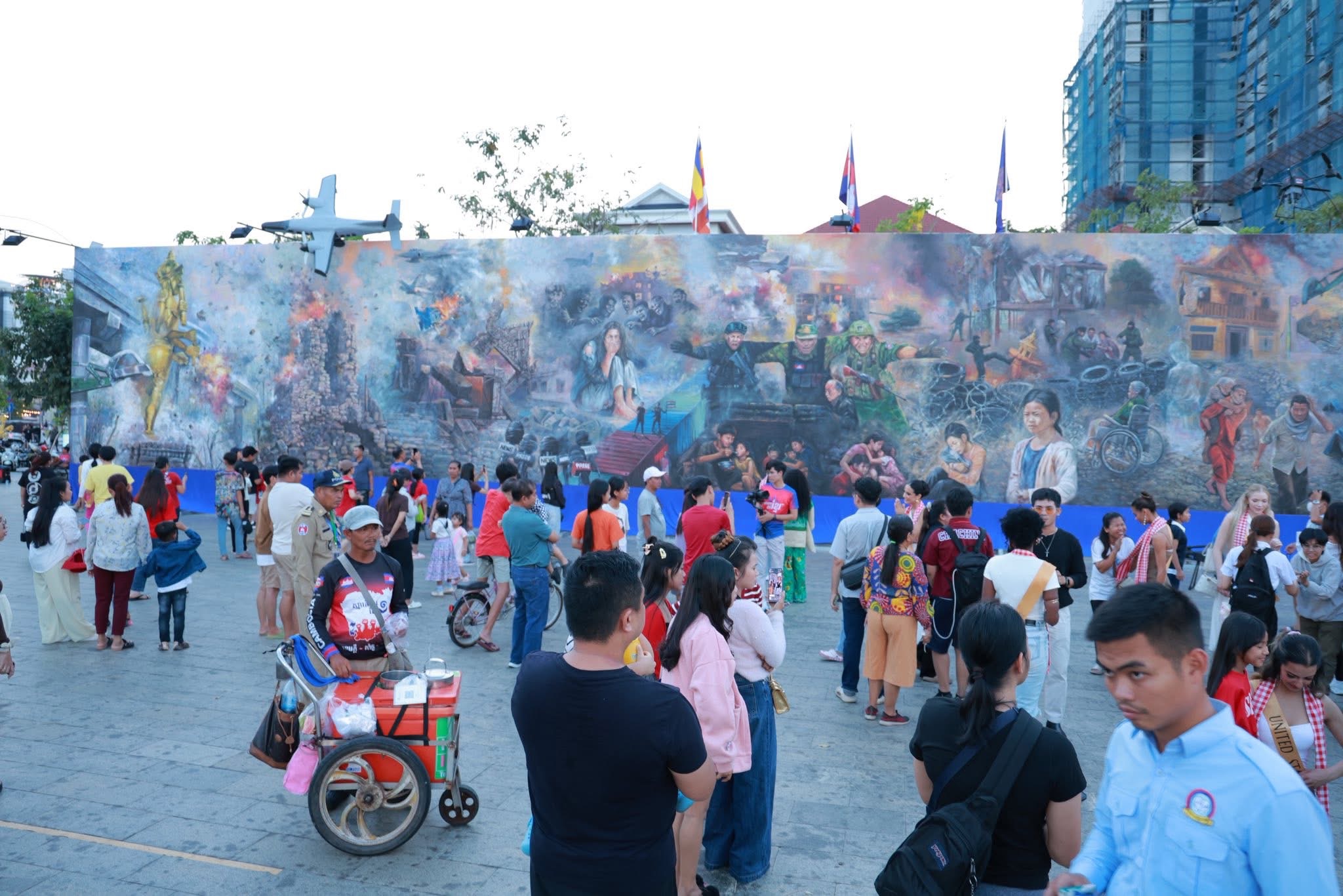 សូមបញ្ជាក់ដែរថា ការគូរគំនូរផ្ទាំងដ៏ធំនៅកណ្តាលរាជធានីភ្នំពេញនេះ មានប្រវែង ៣៥ម៉ែត្រ កម្ពស់៥ ម៉ែត្រនេះ បានចាប់ផ្តើមពីថ្ងៃទី២០ ខែកុម្ភៈ ឆ្នាំ២០២៦ ក្រោមប្រធានបទ «សិល្បៈដើម្បីសន្តិភាព» ដើម្បីបង្ហាញពីសកម្មភាព និងបរិបទនានា ដែលបង្ហាញពីស្នាមរបួស ការខ្ទេចខ្ទាំ ភាពសោកសៅ និងការឈឺចាប់ដែលបណ្តាលមកពីសង្គ្រាម និងជម្លោះព្រំដែន ដែលថៃបានបើកការឈ្លានពានមកលើទឹកដីនៃប្រទេសកម្ពុជានាពេលកន្លងមក។