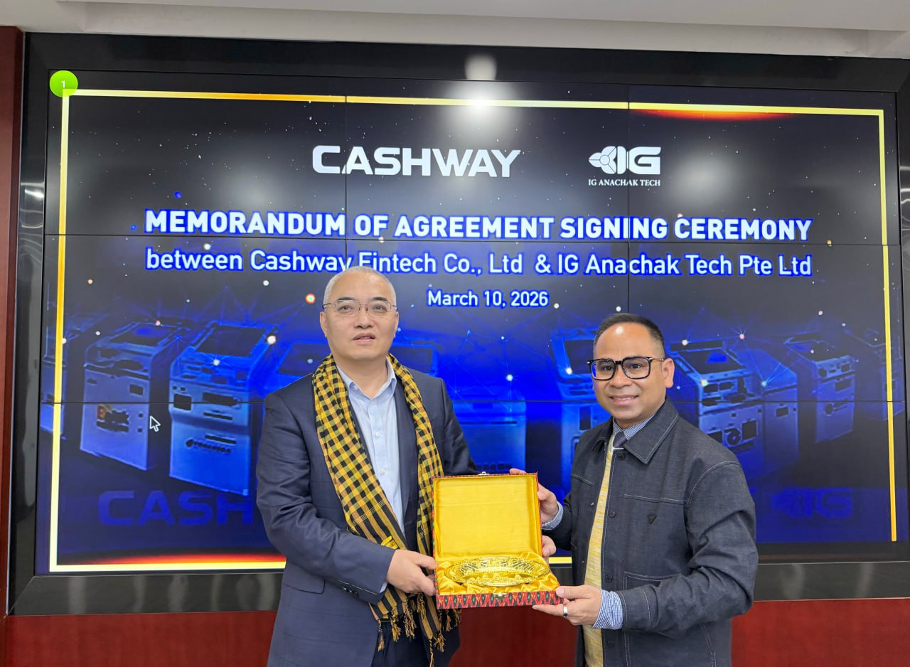 (ធានជីន-ចិន)៖ ក្រុមហ៊ុន Cashway Fintech Co., Ltd. និងក្រុមហ៊ុន IG Anachak Tech Pte. Ltd. នាថ្ងៃទី១០ ខែមីនា ឆ្នាំ២០២៦ បានចុះហត្ថលេខាលើអនុស្សរណៈនៃកិច្ចព្រមព្រៀង ដើម្បីសហការពង្រីកទីផ្សារ និងអភិវឌ្ឍផលិតផល និងដំណោះស្រាយធនាគារឌីជីថលនៅទូទាំងតំបន់អាស៊ីអាគ្នេយ៍។