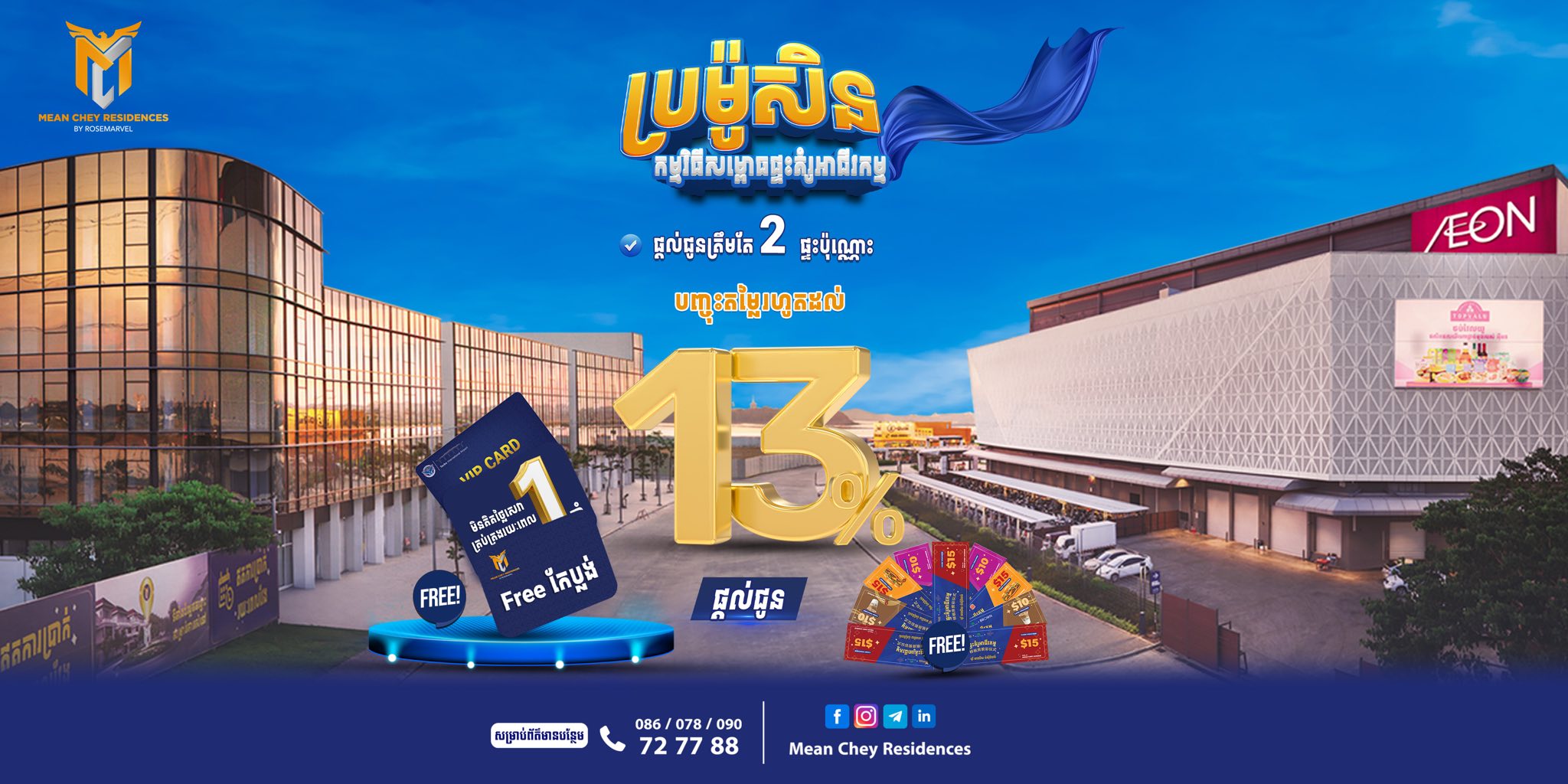 សម្រាប់ព័ត៌មានលម្អិត សូមទំនាក់ទំនងក្រុមការងារ របស់គម្រោងមានជ័យ រ៉េស៊ីដិនស៍ តាមរយៈទូរសព្ទលេខ៖ ០៨៦/ ០៧៨ /០៩០ ៧២ ៧៧ ៨៨ ឬ គេហទំព័រហ្វេសប៊ុកផ្លូវការ (https://www.facebook.com/MeanCheyResidences60m)