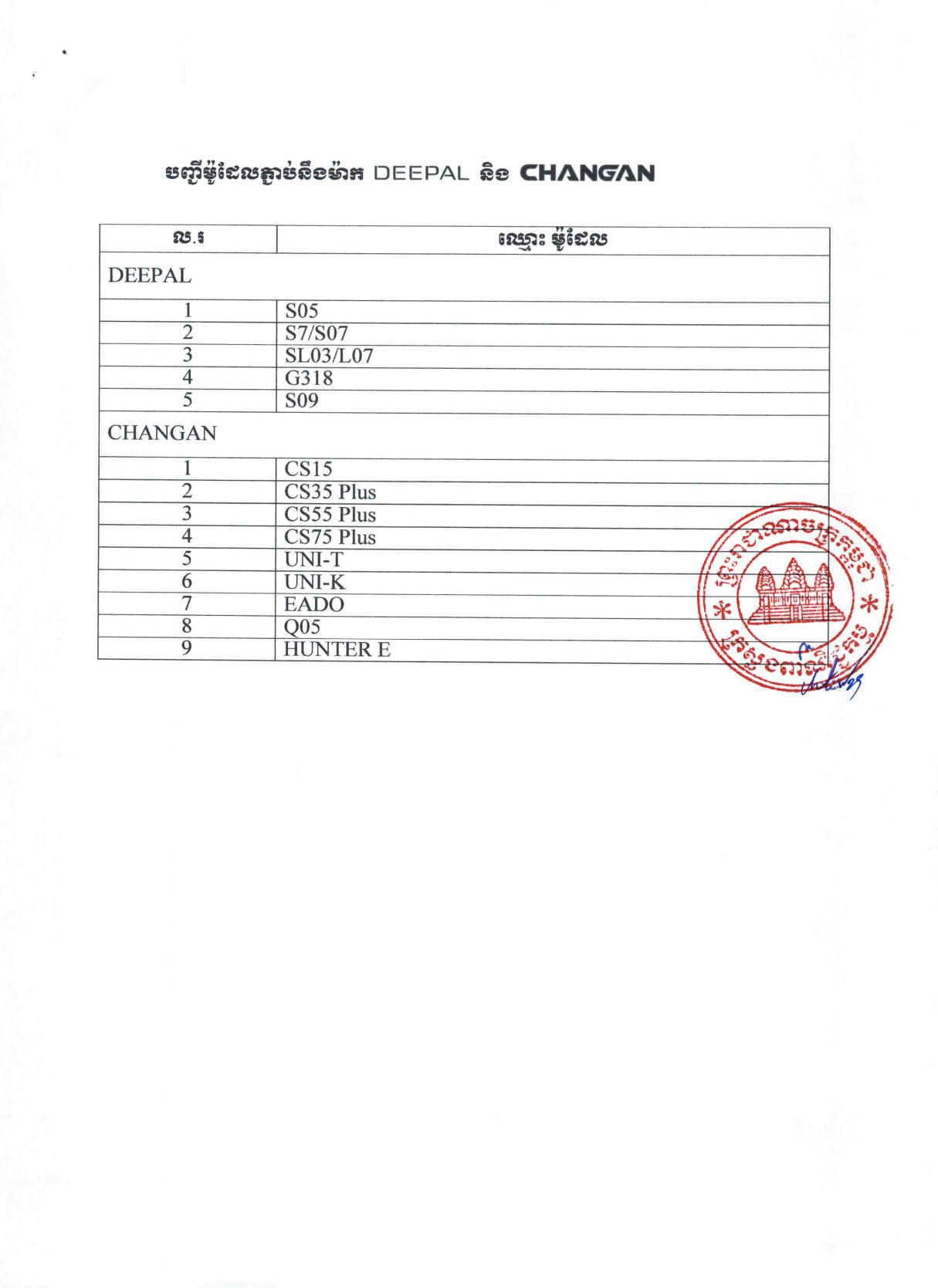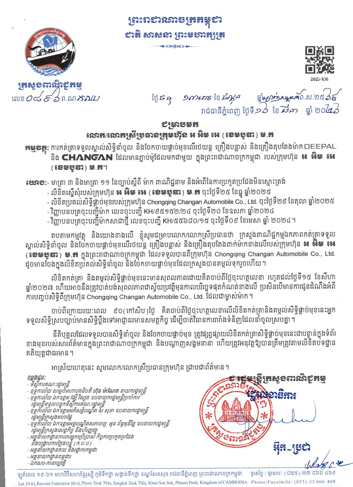 ក្រសួងពាណិជ្ជកម្មជូនដំណឹងអំពីសិទ្ធិនាំចូល និងចែកចាយផ្តាច់មុខលើរថយន្តម៉ូដែល DEEPAL SO5 និង CHANGAN NEVO HUNTER E រួមទាំងម៉ូដែលដទៃទៀតរបស់ CHANGAN និង DEEPAL របស់ក្រុមហ៊ុន RMA CAMBODIA