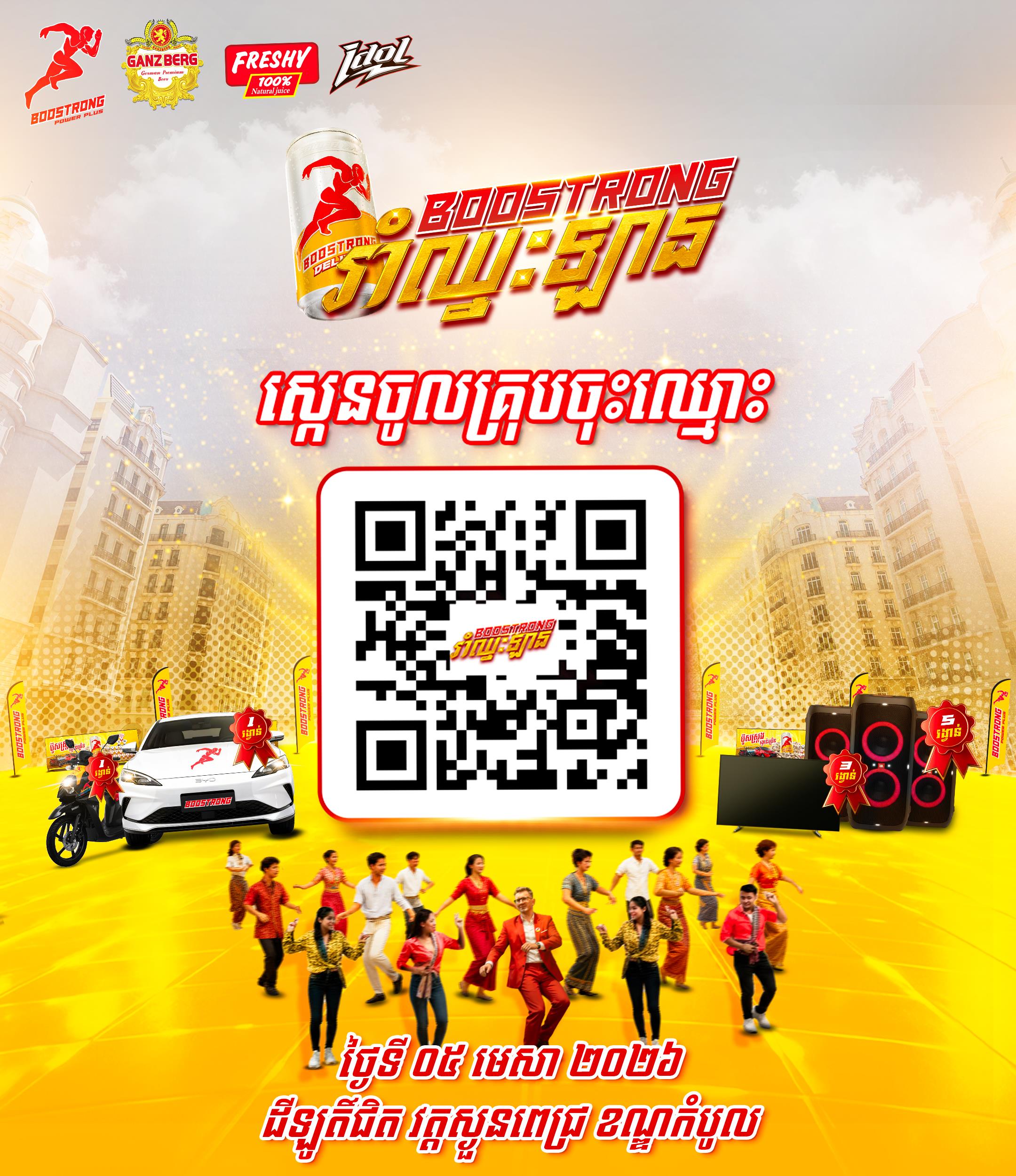 (ភ្នំពេញ)៖ រាំរាល់ដងបានសប្បាយ តែពេលនេះរាំបានឡាន ដូច្នេះបងប្អូនប្រយ័ត្នស្ដាយក្រោយ បើមិនបានចុះឈ្មោះប្រកួតរាំឥឡូវនេះ ព្រោះឱកាសកម្រពុំធ្លាប់មាន គ្រាន់តែចេះរាំសោះ មានឱកាសឈ្នះឡានអគ្គិសនី EV ថ្មីខ្លាញ់គោ ម៉ូតូថ្មី និងរង្វាន់ជាច្រើនពីប៊ូសស្រ្តង ក្នុងព្រឹត្តិការណ៍ «ប៊ូសស្រ្តង រាំឈ្នះឡាន»។ ការប្រកួត នឹងធ្វើឡើងនៅថ្ងៃអាទិត្យ ទី៥ ខែមេសា ឆ្នាំ២០២៦ នៅជិតវត្តស្ថួនពេជ្រ ខណ្ឌកំបូល រាជធានីភ្នំពេញ ចាប់ពីម៉ោង ៣រសៀលតទៅ។