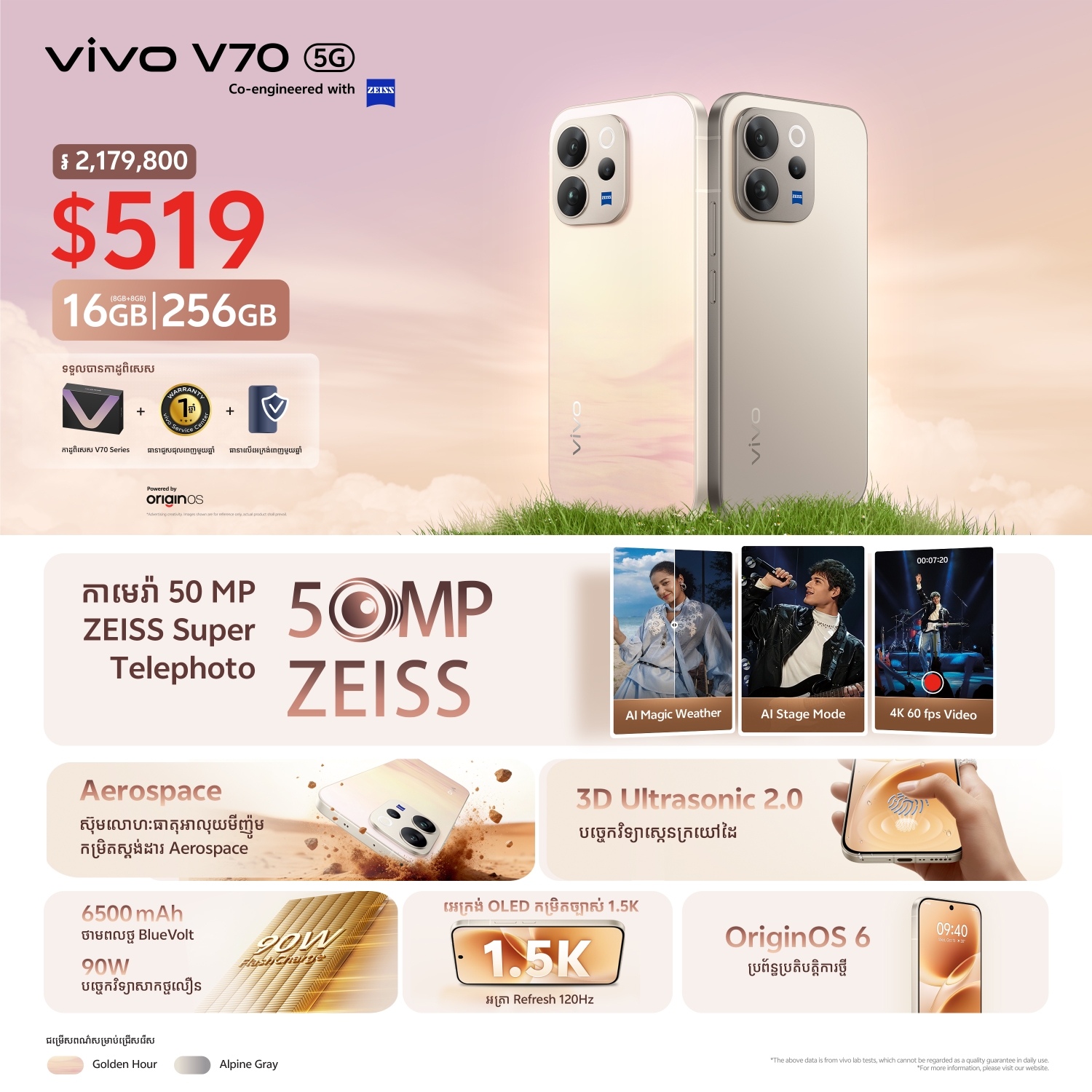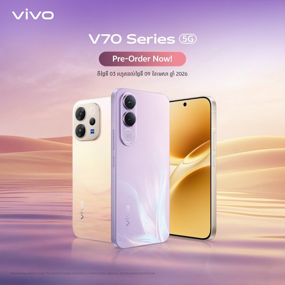 (ភ្នំពេញ)៖ vivo កម្ពុជាបាននាំយកនូវស៊េរីកំពូល V70 series ដែលឥឡូវនេះបានបើកបញ្ជាទិញជាមុនហើយ ចាប់ពីថ្ងៃទី០៣ រហូតដល់ថ្ងៃទី០៩ ខែមេសា ឆ្នាំ២០២៦នេះ។ ក្នុងស៊េរីថ្មីនេះជាជំនួយការដ៏ស័ក្តិសមបំផុត សម្រាប់ការថតរូបជាមួយមុខងារថ្មីៗ និងលក្ខណៈពិសេសជាច្រើន។