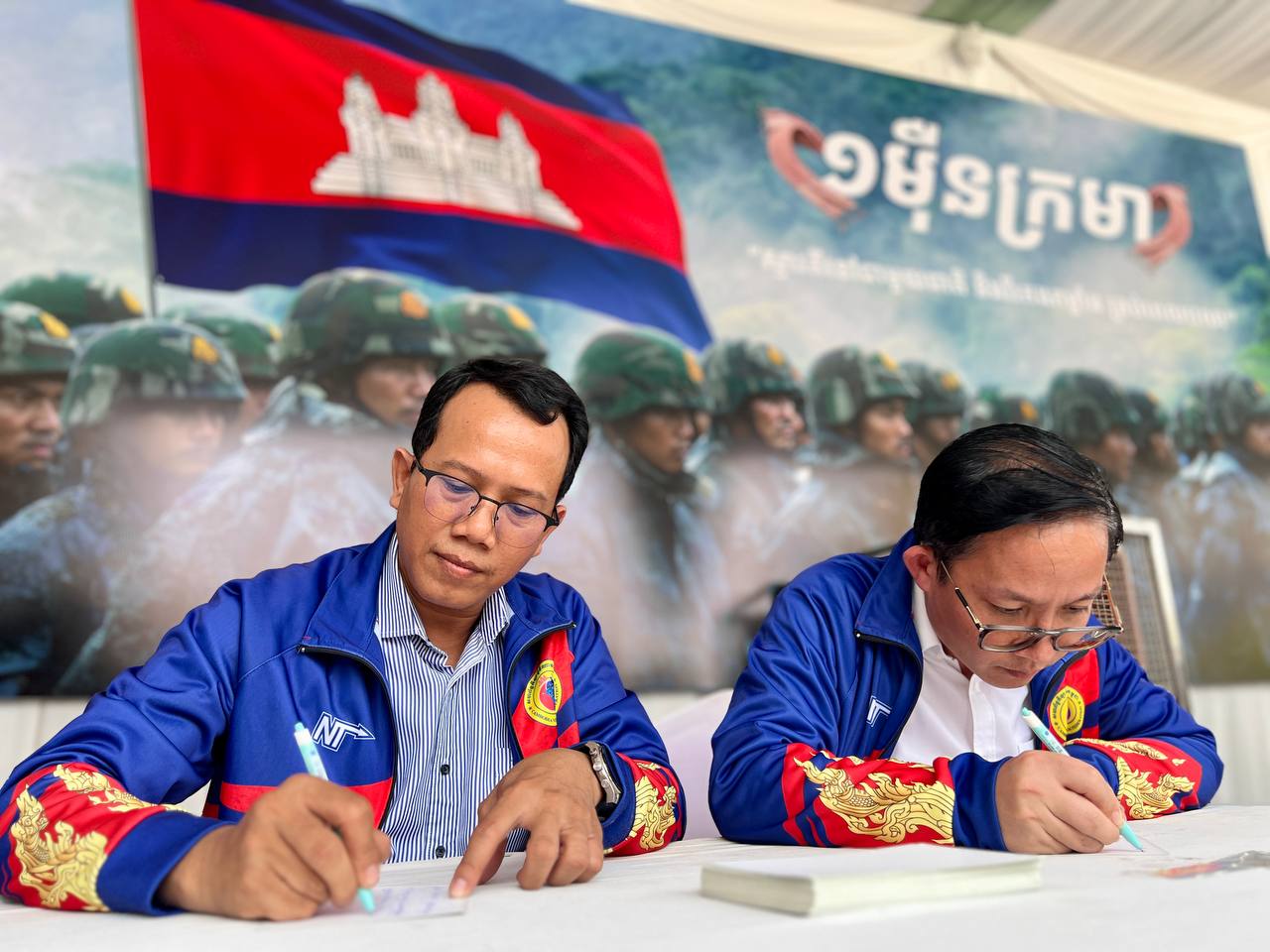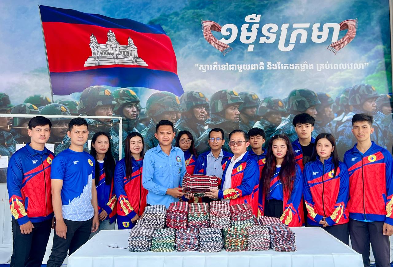 (ភ្នំពេញ)៖ ដើម្បីចូលរួមគាំទ្រដល់យុទ្ធនាការ «១ម៉ឺនក្រមា ១ម៉ឺនសារជូនពរ ដើម្បីវីរៈកងកម្លាំងជួរមុខ នៅរសៀលថ្ងៃទី០៣ ខែមេសានេះ ថ្នាក់ដឹកនាំ គ្រូបង្វឹក និងកីឡាករ-កីឡាការិនី នៃសហព័ន្ធកីឡាវ៉ូវីណាមកម្ពុជា បានរួមគ្នាផ្ដល់ជូននូវក្រមា និងចូលរួមសរសេរសារជូនពរ ដើម្បីបង្ហាញនូវការគោរព ដឹងគុណ ដល់វីរៈកងទ័ព វីរៈនគរបាល ដែលឈរជើងយ៉ាងអង់អាចក្លាហាន ដើម្បីការពារបូរណភាពទឹកដីនៅតាមបណ្ដោយព្រំដែន។