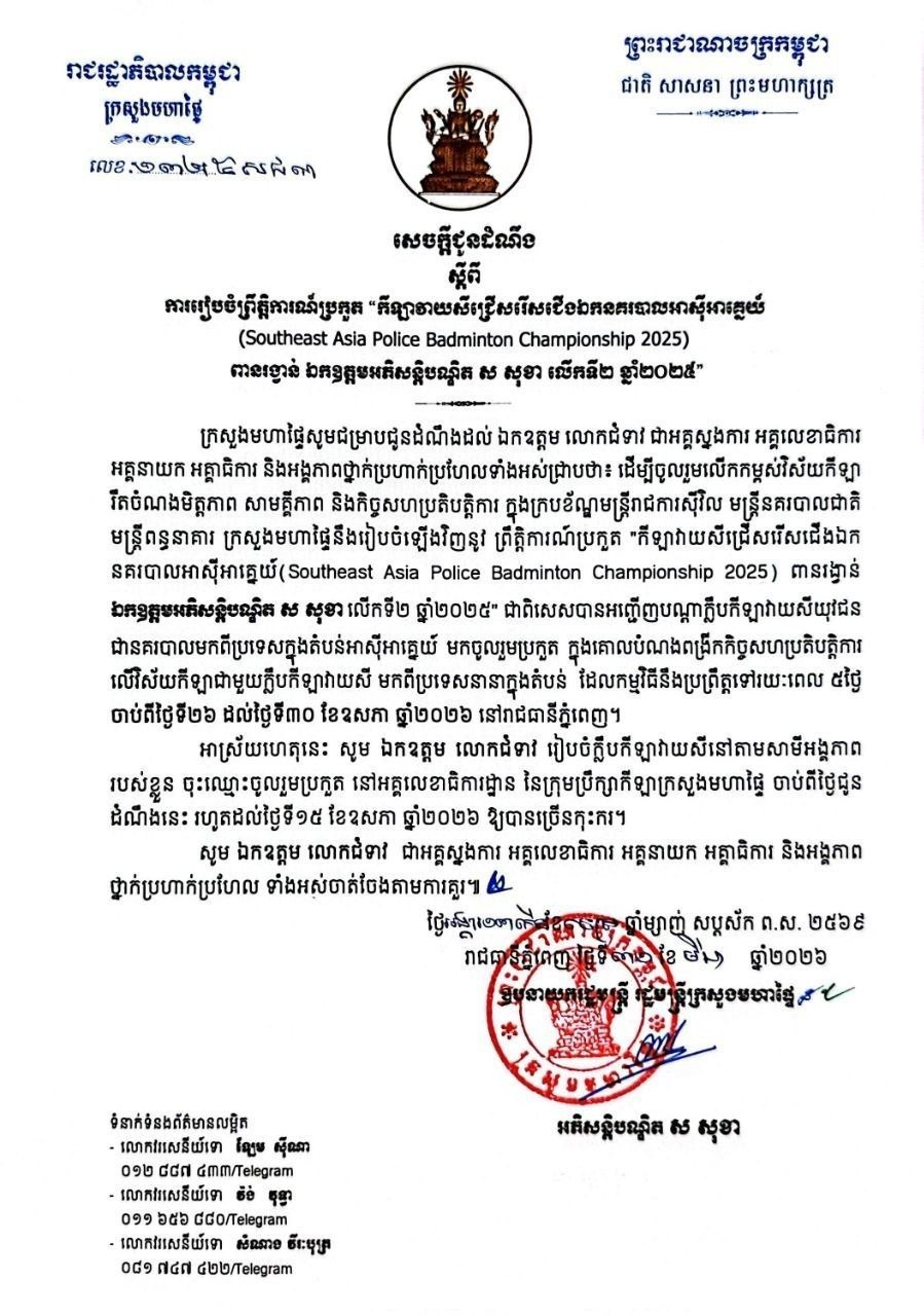 (ភ្នំពេញ)៖ ក្រសួងមហាផ្ទៃ បានប្រកាសនឹងរៀបចំព្រឹត្តិការណ៍ប្រកួតកីឡាវាយសី ជើងឯកនគរបាលអាស៊ីអាគ្នេយ៍ (Southeast Asia Police Badminton Championship) ពានរង្វាន់ឯកឧត្តមអភិសន្តិបណ្ឌិត ស សុខា លើកទី២ ឆ្នាំ២០២៥ រយៈពេល ៥ថ្ងៃ ចាប់ពីថ្ងៃទី២៦-៣០ ខែឧសភា ឆ្នាំ២០២៦ ខាងមុខនៅរាជធានីភ្នំពេញ។