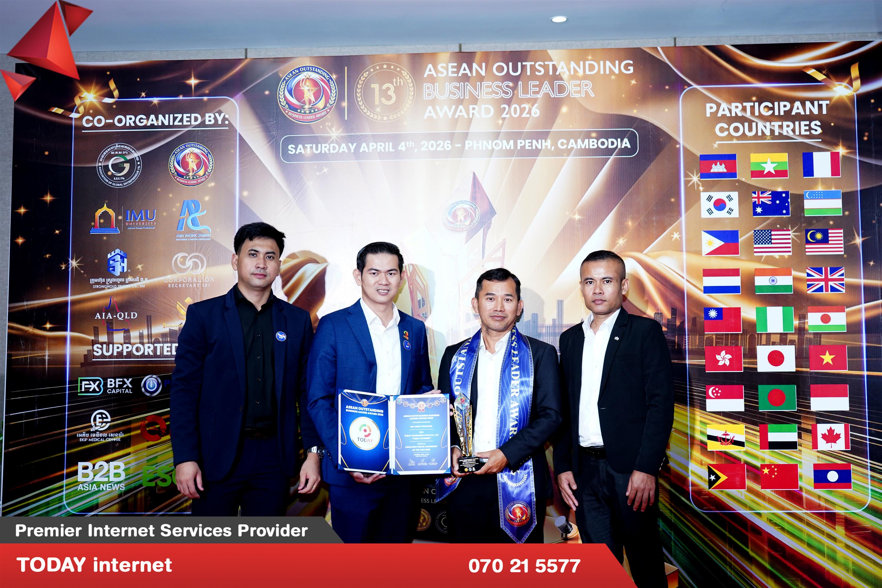 (ភ្នំពេញ)៖ ក្រុមហ៊ុន TODAY internet គឺជាក្រុមហ៊ុនផ្ដល់សេវាអុីនធឺណិតកម្រិតខ្ពស់ដែលបង្កើតឡើង ដោយស្នាដៃកូនខ្មែរចាប់តាំងពីឆ្នាំ ២០១៦ មកម្ល៉េះ។ កាលពីពេលថ្មីៗនេះក្រុមហ៊ុន TODAY internet បានទទួលពានរង្វាន់ «ASEAN Outstanding Business Leader Award 2026»។ កម្មវិធីនេះគឺជាកម្មវិធីមួយទទួលស្គាល់នូវធុរកិច្ចក្នុងតំបន់ និងព្រឹត្តិការណ៍ផ្តល់ពានរង្វាន់ក្នុងគោលបំណងអបអរសាទរ និងផ្តល់កិត្តិយសទៅដល់សហគ្រាសធុនតូច និងមធ្យម (SMEs) ដែលទទួលបានជោគជ័យនៅទូទាំងអាស៊ីសម្រាប់ដំណើរការអាជីវកម្មឆ្នើម ការរីកលូតលាស់ ការបង្កើតថ្មី និងឧត្តមភាព។ សម្រាប់ពានរង្វាន់នេះដែលគឺទទួលស្គាល់នូវឧត្តមភាពក្នុងការអនុវត្តអាជីវកម្ម ភាពជាអ្នកដឹកនាំ ការច្នៃប្រឌិត និងកំណើន SME នៅទូទាំងតំបន់អាស៊ី។
