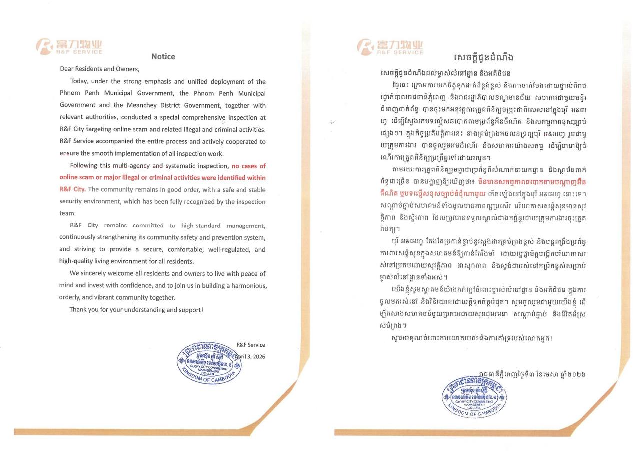 បុរី «អ & អេហ្វ» ប្រកាសថា ពុំមានសកម្មភាពឆបោកតាមបណ្ដាញអ៉ីនធ័រណិត និងបទល្មើសខុសច្បាប់ណាមួយ កើតឡើងក្នុងបុរីឡើយ ក្រោយកម្លាំងចម្រុះចុះត្រួតពិនិត្យ