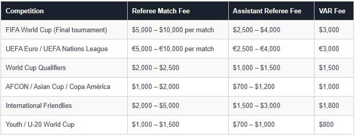 FIFA ចំណាយទៅលើប្រាក់ខែ ក៏ដូចប្រាក់ពលកម្មលើអាជ្ញាកណ្តាល សម្រាប់កម្មវិធីទាំងឡាយណាដែលរៀបចំដោយ សហព័ន្ធតែប៉ុណ្ណោះមានដូចជា World Cup, Confederation Cup, Club World Cup រួមទាំង Under-20 World Cup ជាដើម។