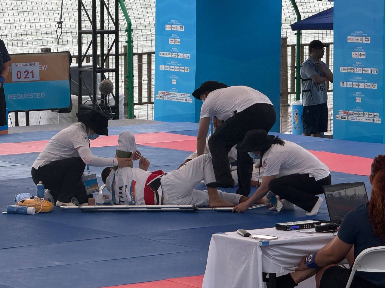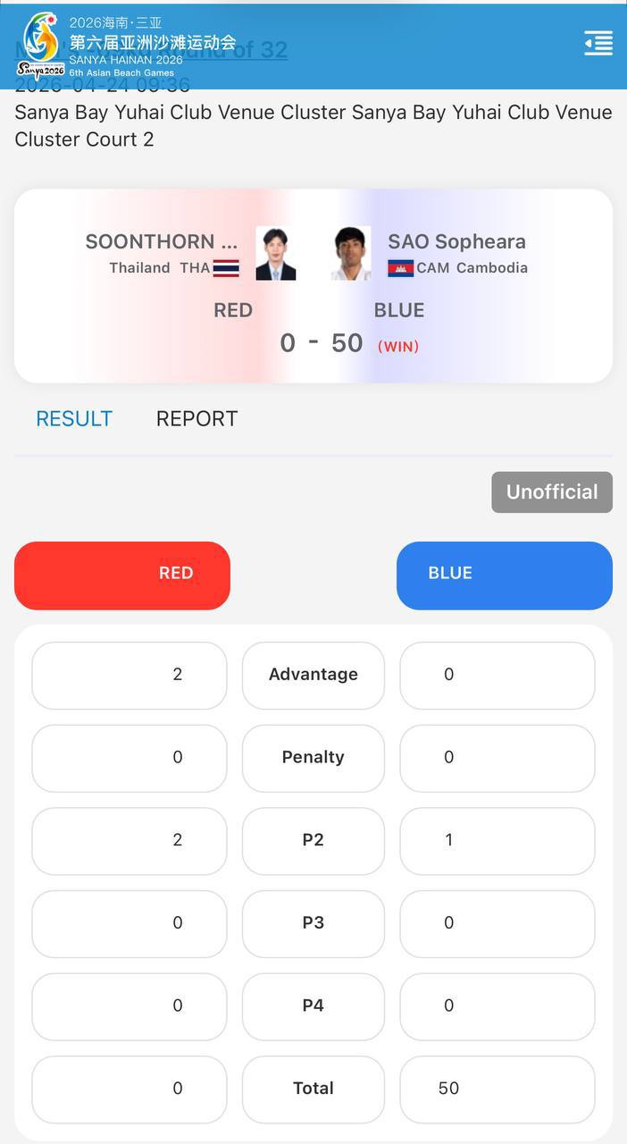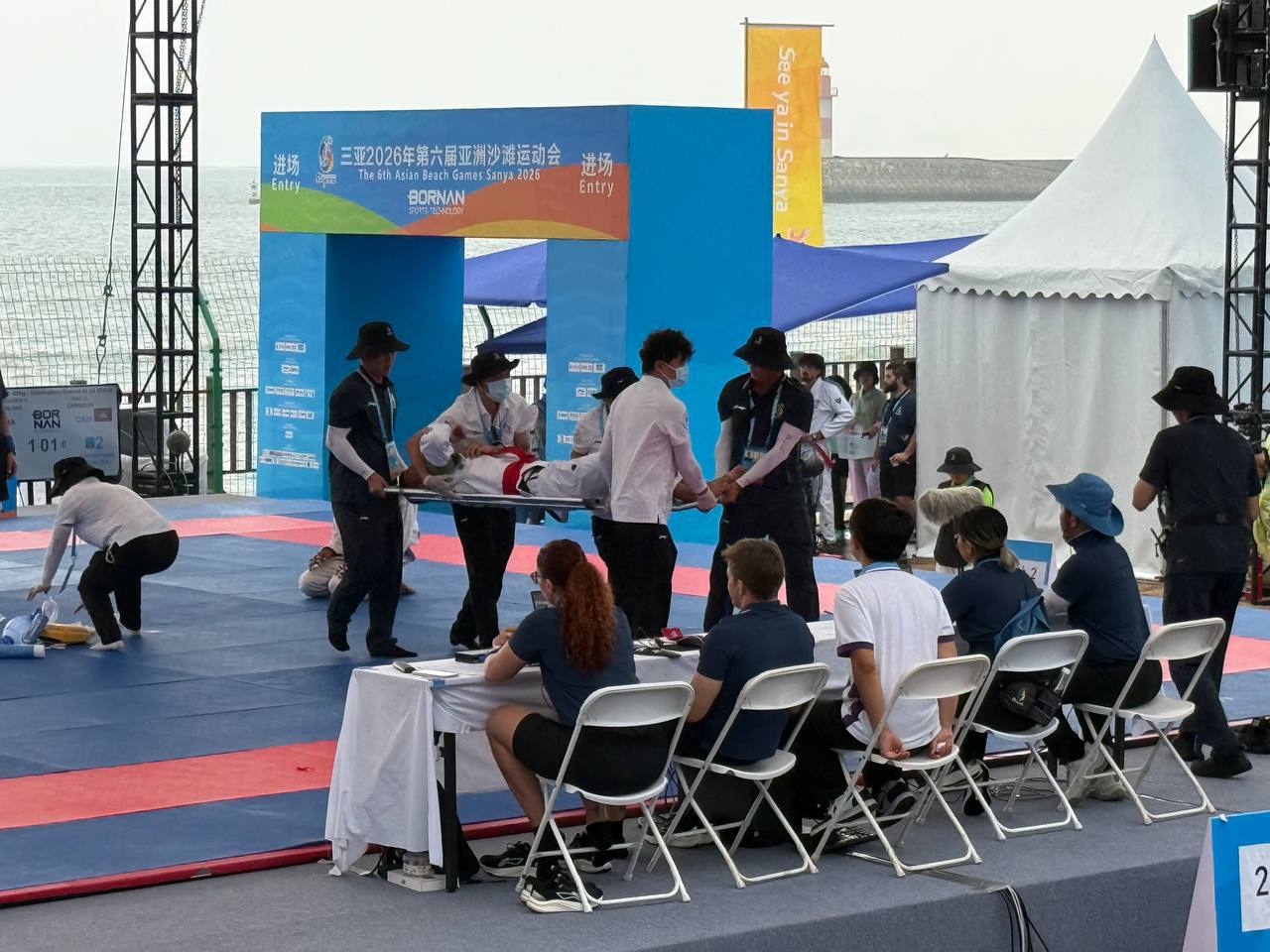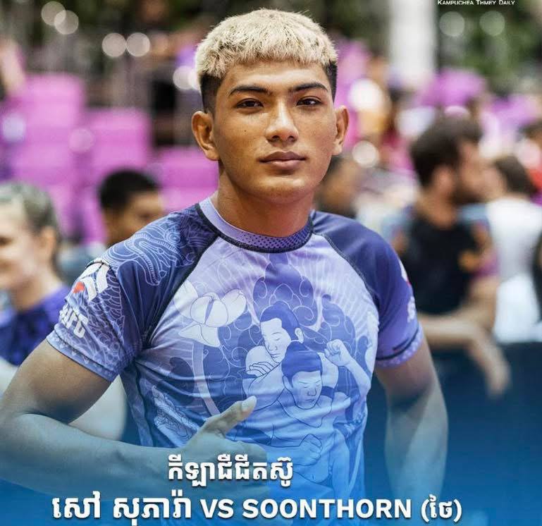 (ភ្នំពេញ)៖ កីឡាករជឺជីតស៊ូជម្រើសជាតិកម្ពុជា សៅ សុភារ៉ា ផ្ដួលកីឡាករ Soonthorn Sarin របស់ថៃឱ្យបោះបង់ការប្រកួត ដោយរបួសស្មារហូតត្រូវសែងចេញពីទីលាន នៅព្រឹកថ្ងៃទី២៤ ខែមេសានេះ ក្នុងព្រឹត្តិការណ៍កីឡាលើឆ្នេរខ្សាច់អាស៊ី លើកទី៦ នៅទីក្រុង Sanya ប្រទេសចិន។