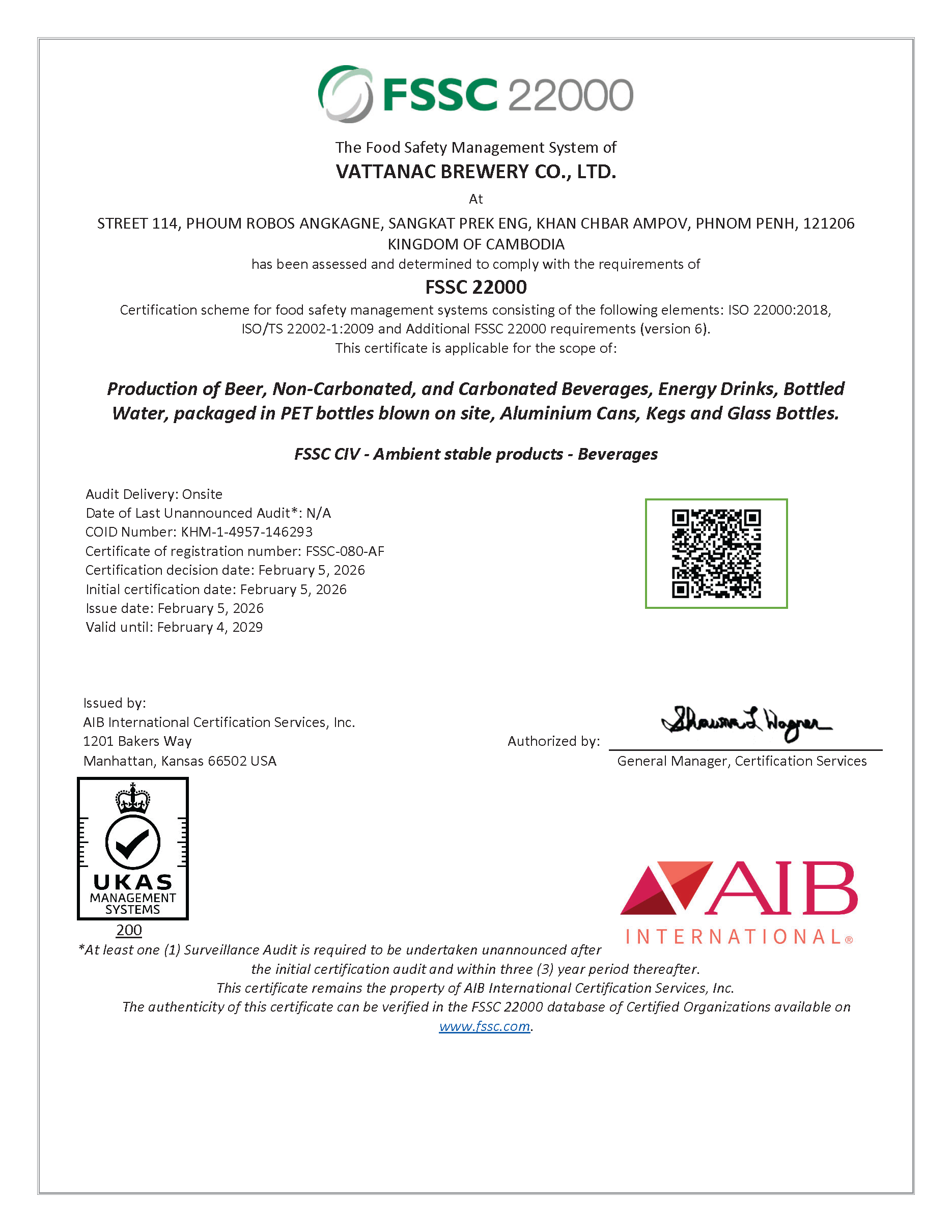 ទោះមានវត្តមានក្នុងទីផ្សារត្រឹមរយៈពេលខ្លី ក្រុមហ៊ុន វឌ្ឍនៈ តែងផ្តល់តម្លៃ និងយកចិត្តទុកដាក់ខ្ពស់បំផុតលើកត្តាគុណភាព សុវត្ថិភាពជាចម្បង ហើយថ្មីៗនេះ ក្រុមហ៊ុន វឌ្ឍនៈ បានទទួលវិញ្ញាបនបត្រ FSSC 22000 ហើយបានក្លាយជាក្រុមហ៊ុនក្នុងស្រុកដំបូងបំផុតក្នុងប្រទេសកម្ពុជាទទួលស្គាល់ដោយប្រព័ន្ធសុវត្ថិភាពចំណីអាហារពិភពលោកសម្រាប់ផលិតផលស្រាបៀរ ភេសជ្ជៈ និងទឹកពិសា។ ការទទួលស្គាល់ពីស្តង់ដារសុវត្ថិភាពចំណីអាហារជាសកលនេះ ត្រូវបានឆ្លងកាត់ការត្រួតពិនិត្យ វាយតម្លៃ ការធ្វើសវនកម្មឯករាជ្យលើខ្សែសង្វាក់ផលិតកម្មទាំងមូល ទាំងគុណភាព និងអនាម័យបរិស្ថាន។