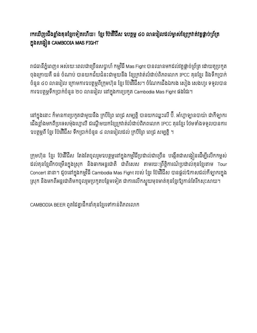 CAMBODIA BEER ពួតដៃគ្នាដឹកនាំគុនខ្មែរទៅកាន់ពិភពលោក..!៕