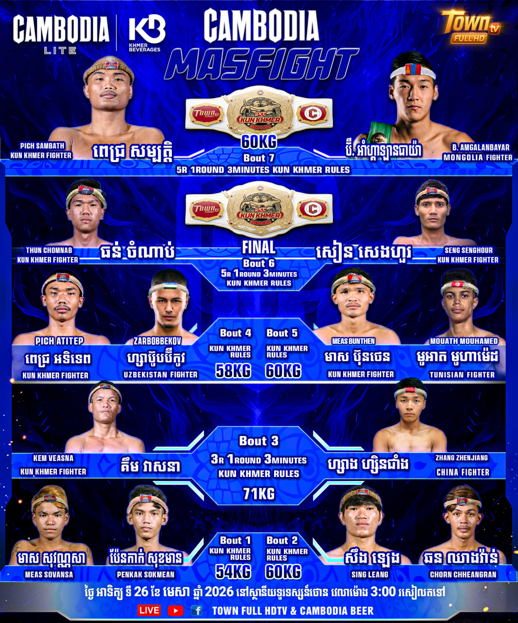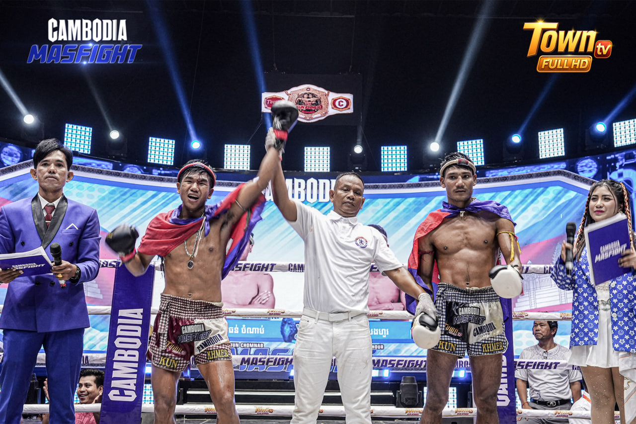 (ភ្នំពេញ)៖ អស់រយៈពេលជាច្រើនសប្តាហ៍ កម្មវិធី Mas Fight បានឈានមកដល់វគ្គផ្តាច់ព្រ័ត្រ ដោយគូប្រកួតចុងក្រោយ គឺ ធន់ ចំណាប់ បានយកជ័យជំនះជាមួយនឹង ខ្សែក្រវាត់លំដាប់ពិភពលោក IPCC គុនខ្មែរ និងទឹកប្រាក់ចំនួន ៤០លានរៀល ក្រោមការឧបត្ថម្ភពីក្រុមហ៊ុន ខ្មែរ ប៊ែវើរីជីស។ ចំណែកជើងឯករង សៀង សេងហួរ ទទួលបានការឧបត្ថម្ភទឹកប្រាក់ចំនួន ២០លានរៀល នៅក្នុងការប្រកួត Cambodia Mas Fight ផងដែរ។