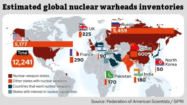 បើនិយាយពីការស្តុកអាវុធនុយក្លេអ៊ែរវិញ មានចំនួនច្រើនគួរឱ្យភ្ញាក់ផ្អើល ដោយគ្រាន់តែរុស្ស៊ី និងសហរដ្ឋអាមេរិក មានជាង ១០ ០០០គ្រាប់ ស្មើនឹងជិត ៩០% នៃចំនួនសរុបលើពិភពលោក។ ចំណែកចិន បារាំង និងអង់គ្លេស មានអាវុធនុយក្លេអ៊ែរខ្ទង់រយរៀងៗខ្លួន ខណៈប្រទេសផ្សេងទៀតមានចន្លោះពី ៤០ ទៅ ២០០គ្រាប់។